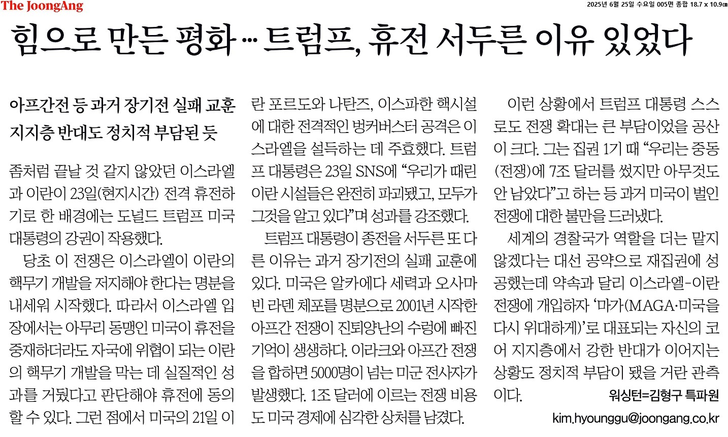 ⑤ 세계의 경찰국가 역할을 더는 맡지 않겠다는 대선 공약으로 재집권에 성공했는데 약속과 달리 이스라엘-이란 전쟁에 개입하자 ‘마가(MAGA·미국을 다시 위대하게)’로 대표되는 자신의 코어 지지층에서 강한 반대가 이어지는 상황도 정치적 부담이 됐을 거란 관측이다.