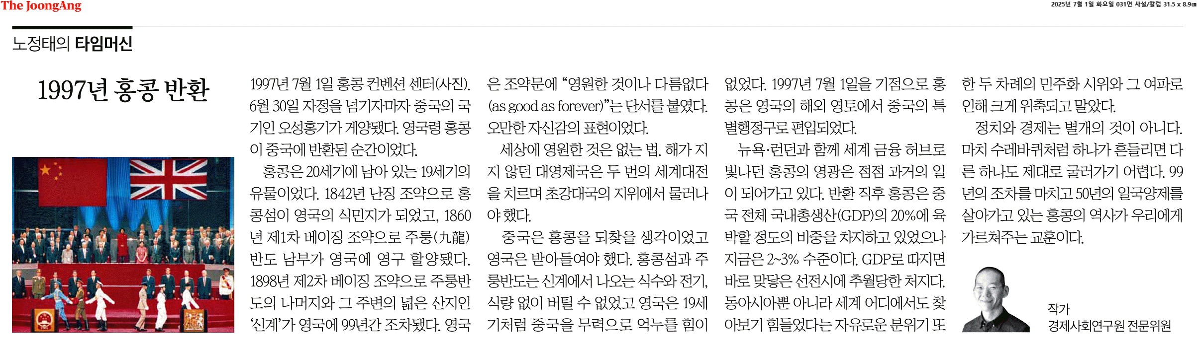 ② 홍콩은 20세기에 남아 있는 19세기의 유물이었다. 1842년 난징 조약으로 홍콩섬이 영국의 식민지가 되었고, 1860년 제1차 베이징 조약으로 주룽(九龍)반도 남부가 영국에 영구 할양됐다. 1898년 제2차 베이징 조약으로 주룽반도의 나머지와 그 주변의 넓은 산지인 ‘신계’가 영국에 99년간 조차됐다. 영국은 조약문에 “영원한 것이나 다름없다(as good as forever)”는 단서를 붙였다. 오만한 자신감의 표현이었다.