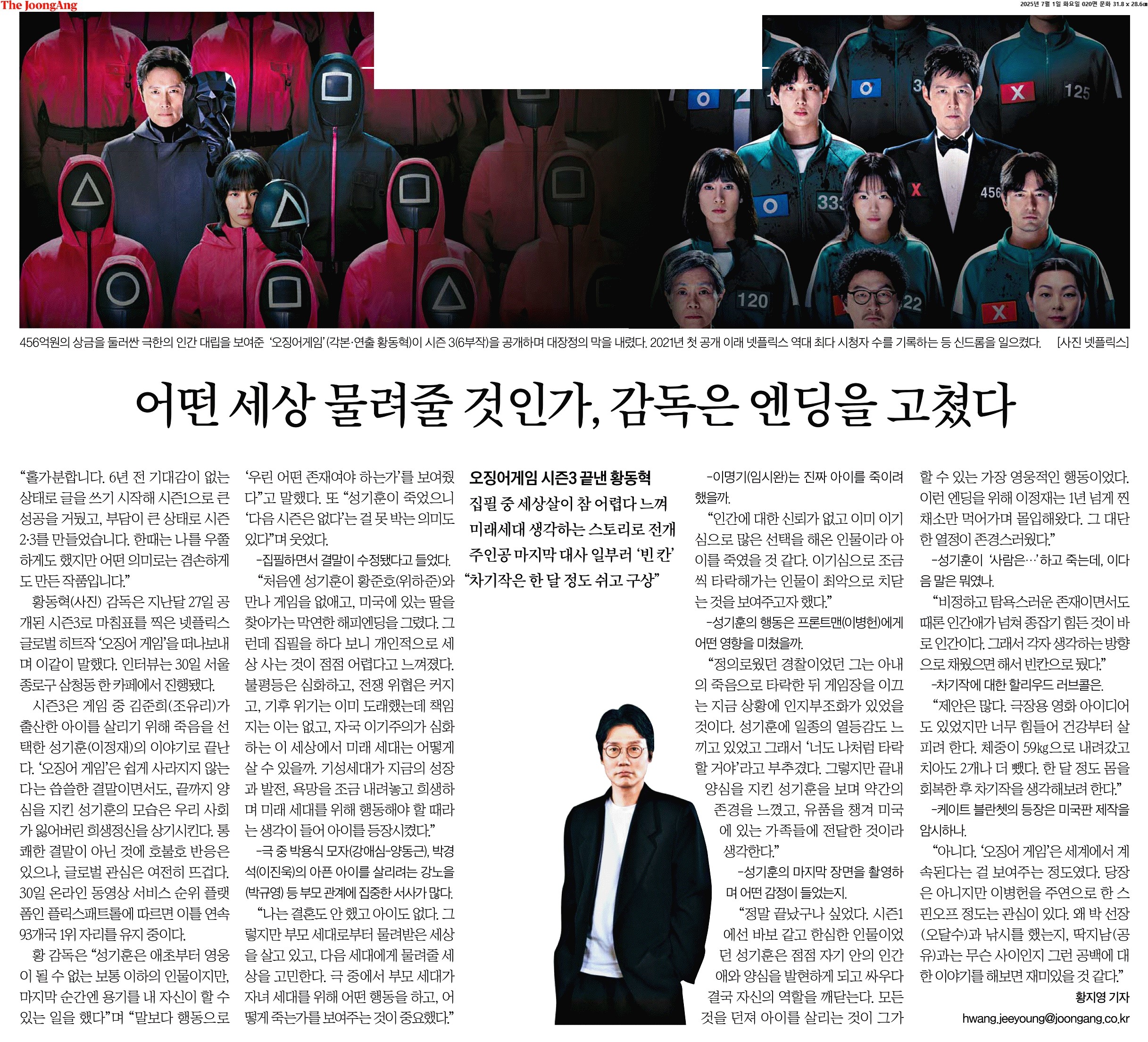 ③ 황 감독은 “성기훈은 애초부터 영웅이 될 수 없는 보통 이하의 인물이지만, 마지막 순간엔 용기를 내 자신이 할 수 있는 일을 했다”며 “말보다 행동으로 ‘우린 어떤 존재여야 하는가’를 보여줬다”고 말했다. 또 “성기훈이 죽었으니 ‘다음 시즌은 없다’는 걸 못 박는 의미도 있다”며 웃었다.