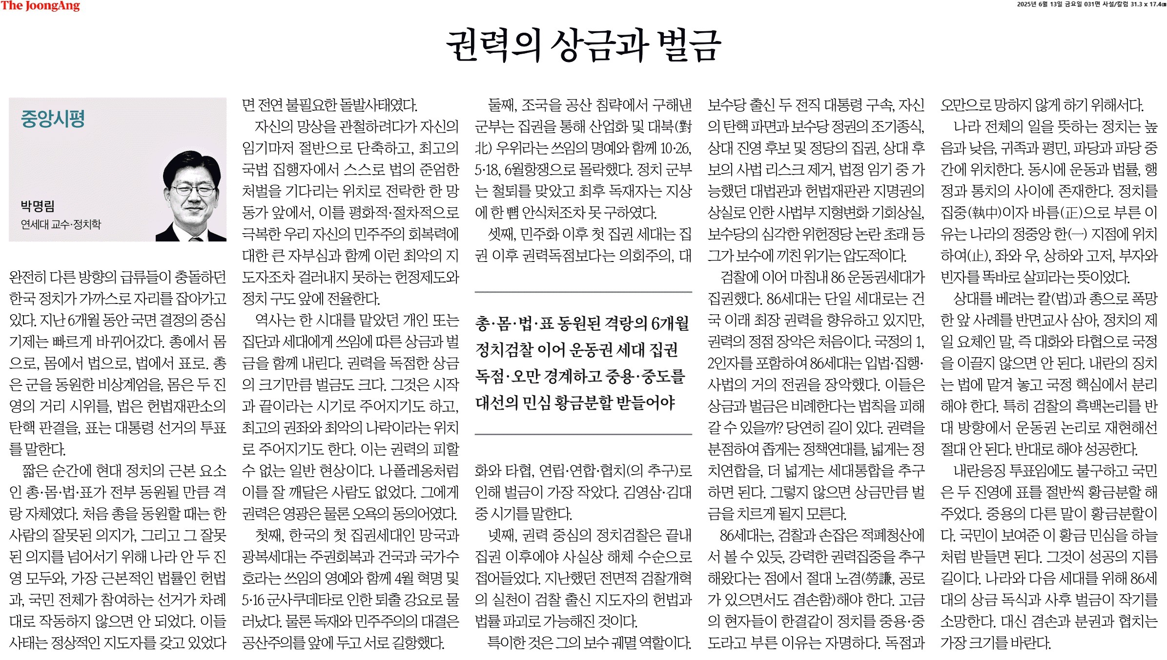 ⑤ 내란응징 투표임에도 불구하고 국민은 두 진영에 표를 절반씩 황금분할 해주었다. 중용의 다른 말이 황금분할이다. 국민이 보여준 이 황금 민심을 하늘처럼 받들면 된다. 그것이 성공의 지름길이다. 나라와 다음 세대를 위해 86세대의 상금 독식과 사후 벌금이 작기를 소망한다. 대신 겸손과 분권과 협치는 가장 크기를 바란다.