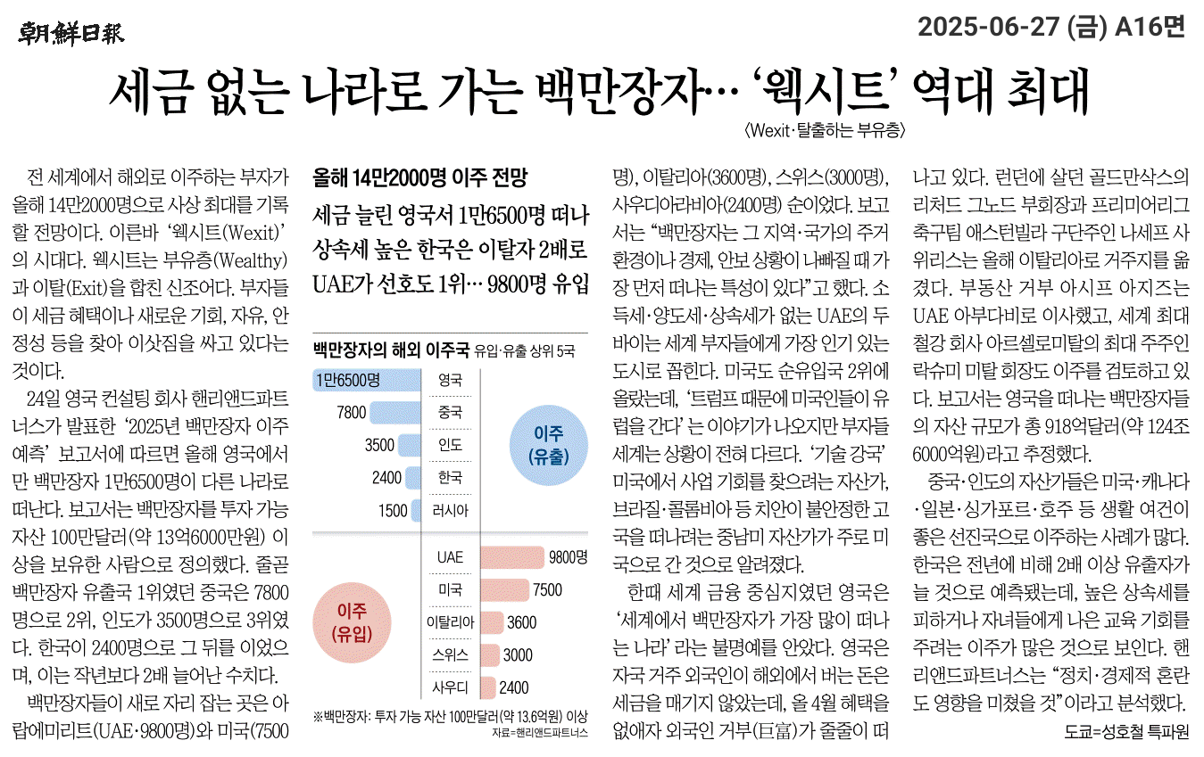 ② 24일 영국 컨설팅 회사 핸리앤드파트너스가 발표한 ‘2025년 백만장자 이주 예측’ 보고서에 따르면 올해 영국에서만 백만장자 1만6500명이 다른 나라로 떠난다. 보고서는 백만장자를 투자 가능 자산 100만달러(약 13억6000만원) 이상을 보유한 사람으로 정의했다. 줄곧 백만장자 유출국 1위였던 중국은 7800명으로 2위, 인도가 3500명으로 3위였다. 한국이 2400명으로 그 뒤를 이었으며, 이는 작년보다 2배 늘어난 수치다.