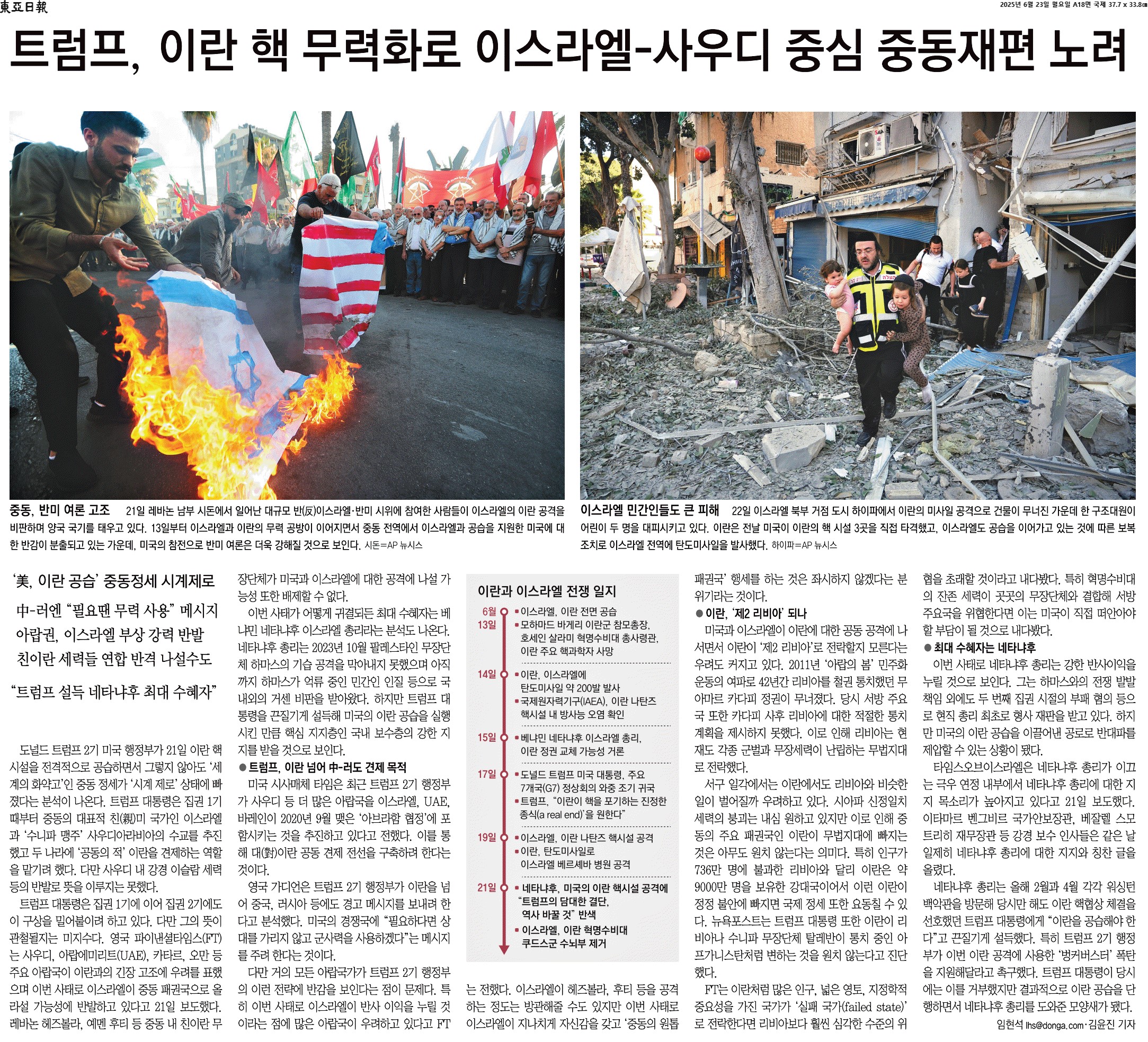 ① 도널드 트럼프 2기 미국 행정부가 21일 이란 핵시설을 전격적으로 공습하면서 그렇지 않아도 ‘세계의 화약고’인 중동 정세가 ‘시계 제로’ 상태에 빠졌다는 분석이 나온다. 트럼프 대통령은 집권 1기 때부터 중동의 대표적 친(親)미 국가인 이스라엘과 ‘수니파 맹주’ 사우디아라비아의 수교를 추진했고 두 나라에 ‘공동의 적’ 이란을 견제하는 역할을 맡기려 했다. 다만 사우디 내 강경 이슬람 세력 등의 반발로 뜻을 이루지는 못했다.