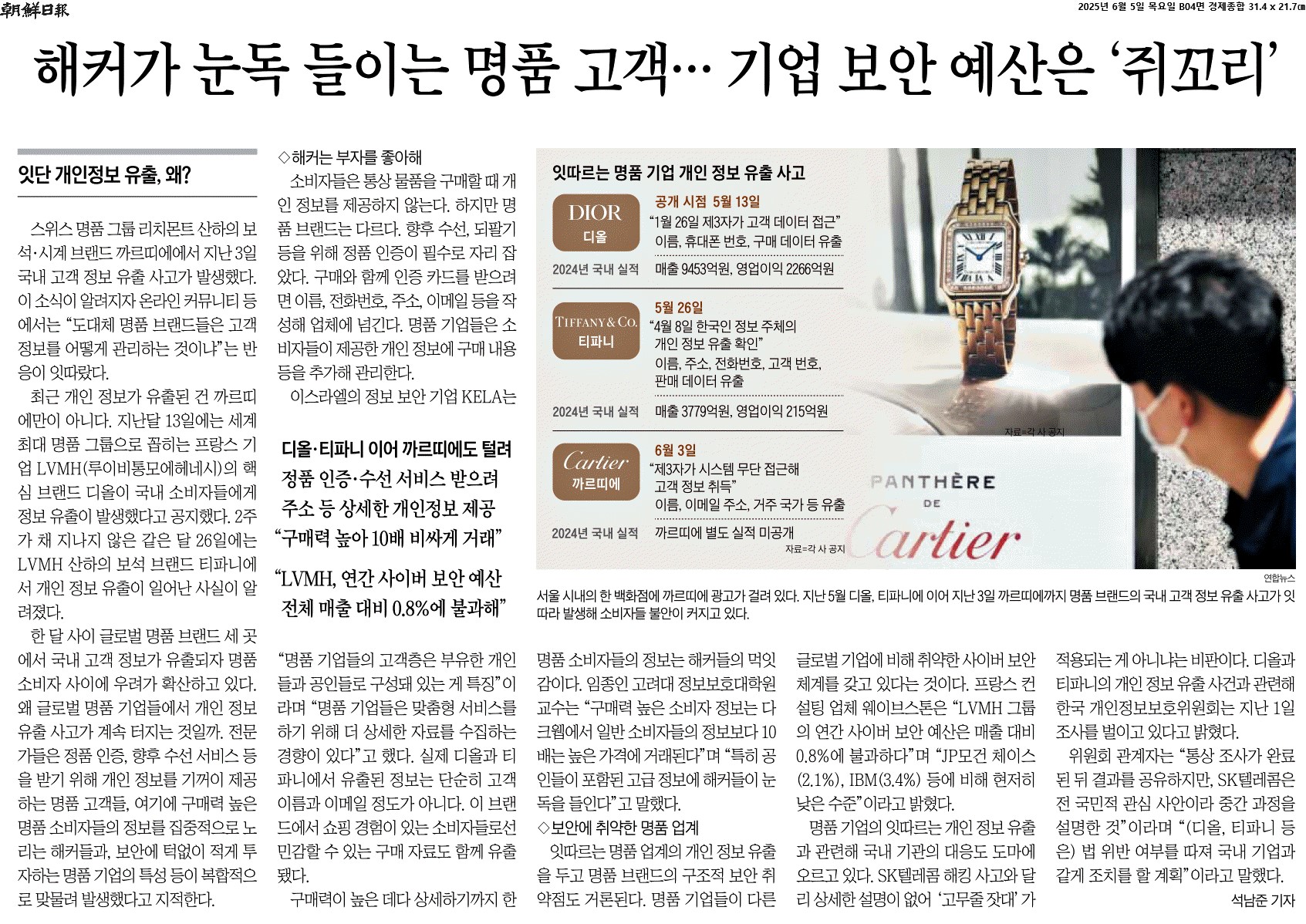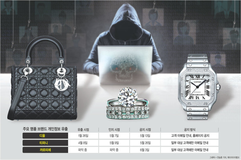 ② 최근 개인 정보가 유출된 건 까르띠에만이 아니다. 지난달 13일에는 세계 최대 명품 그룹으로 꼽히는 프랑스 기업 LVMH(루이비통모에헤네시)의 핵심 브랜드 디올이 국내 소비자들에게 정보 유출이 발생했다고 공지했다. 2주가 채 지나지 않은 같은 달 26일에는 LVMH 산하의 보석 브랜드 티파니에서 개인 정보 유출이 일어난 사실이 알려졌다.