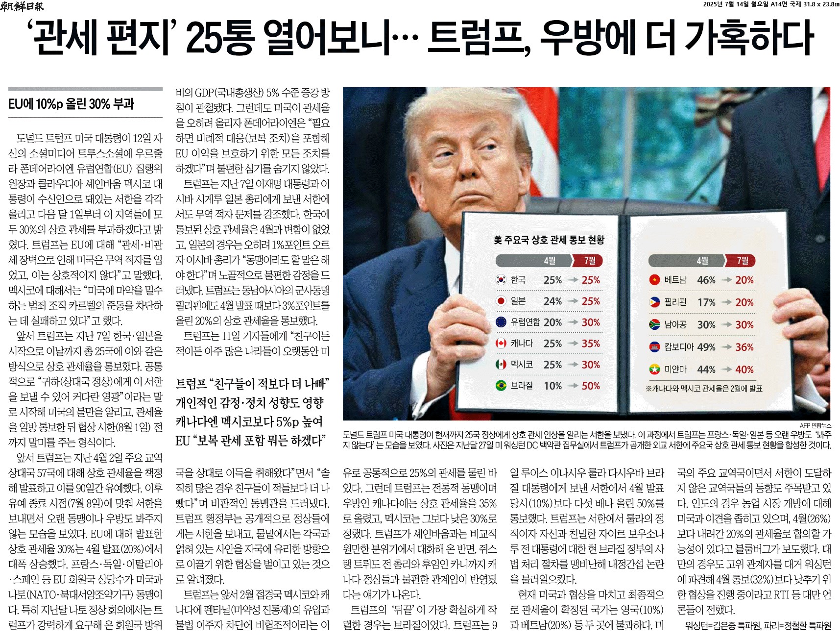 ③ 앞서 트럼프는 지난 4월 2일 주요 교역 상대국 57국에 대해 상호 관세율을 책정해 발표하고 이를 90일간 유예했다. 이후 유예 종료 시점(7월 8일)에 맞춰 서한을 보내면서 오랜 동맹이나 우방도 봐주지 않는 모습을 보였다. EU에 대해 발표한 상호 관세율 30%는 4월 발표(20%)에서 대폭 상승했다.