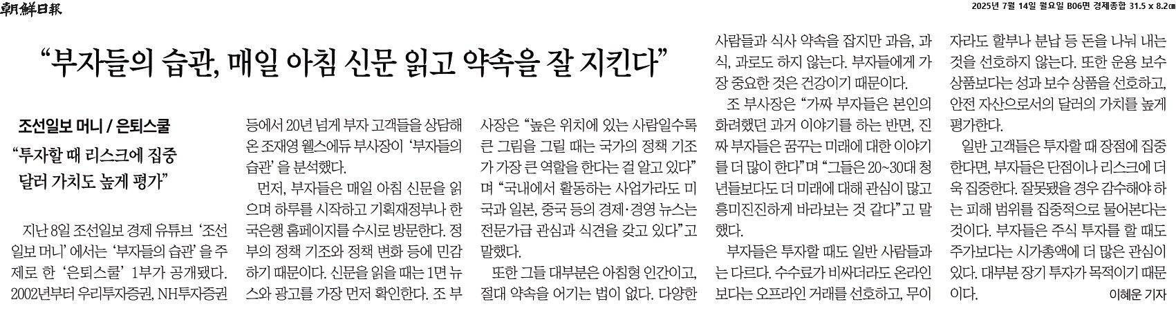 ① 먼저, 부자들은 매일 아침 신문을 읽으며 하루를 시작하고 기획재정부나 한국은행 홈페이지를 수시로 방문한다. 정부의 정책 기조와 정책 변화 등에 민감하기 때문이다. 신문을 읽을 때는 1면 뉴스와 광고를 가장 먼저 확인한다.