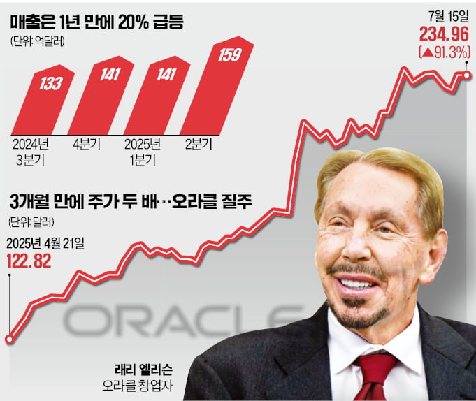 ① 미국 소프트웨어기업 오라클의 주가와 실적, 투자가 인공지능(AI) 열풍에 힘입어 가파르게 상승하고 있다. 최근 3개월 새 주가가 거의 두 배 올랐다. 초대형 클라우드 계약과 데이터센터 투자 확대에 힘입어 성장세는 당분간 이어질 전망이다. 시장에선 오라클을 애플이나 테슬라 대신 핵심 기술주 7인방인 매그니피센트7(M7)에 넣어야 한다는 주장도 나온다.