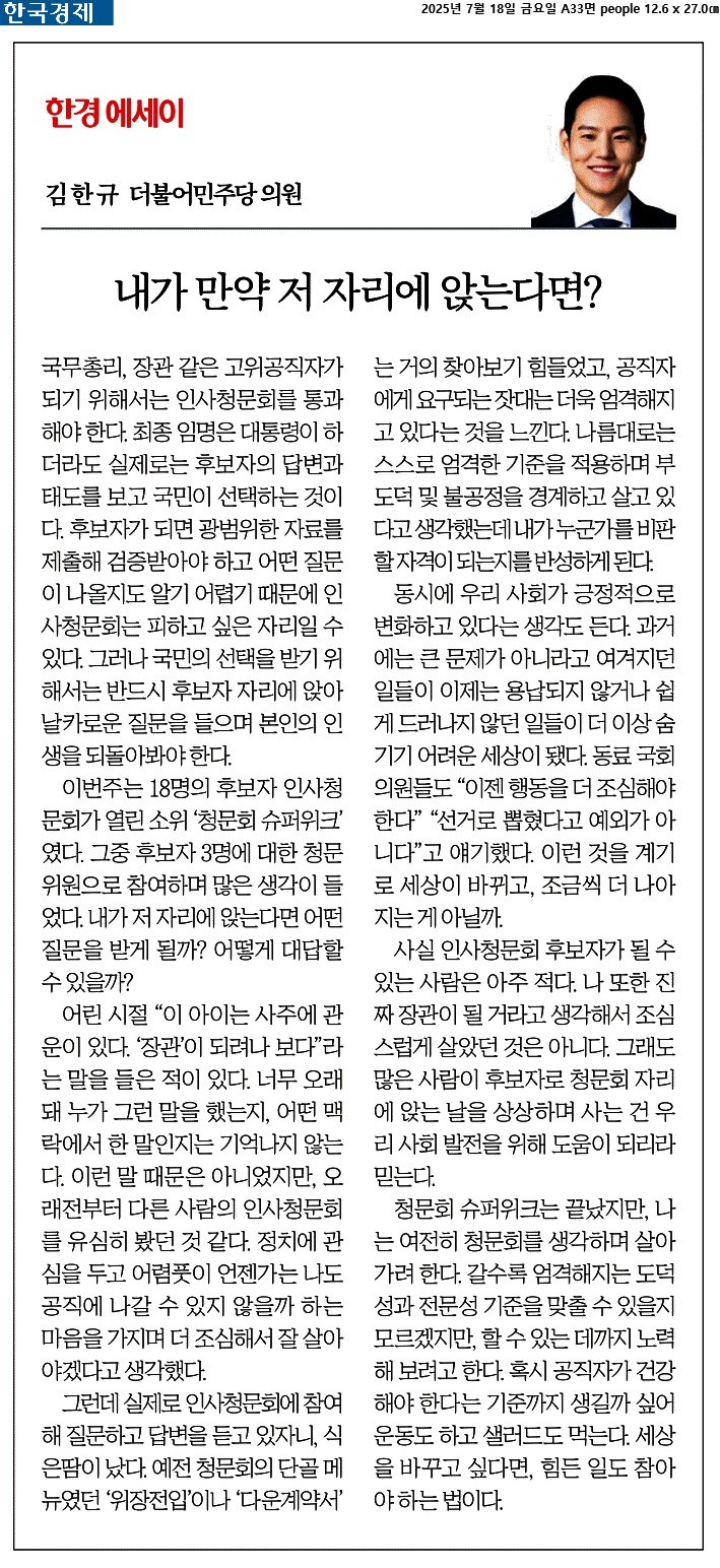 ④ 사실 인사청문회 후보자가 될 수 있는 사람은 아주 적다. 나 또한 진짜 장관이 될 거라고 생각해서 조심스럽게 살았던 것은 아니다. 그래도 많은 사람이 후보자로 청문회 자리에 앉는 날을 상상하며 사는 건 우리 사회 발전을 위해 도움이 되리라 믿는다.