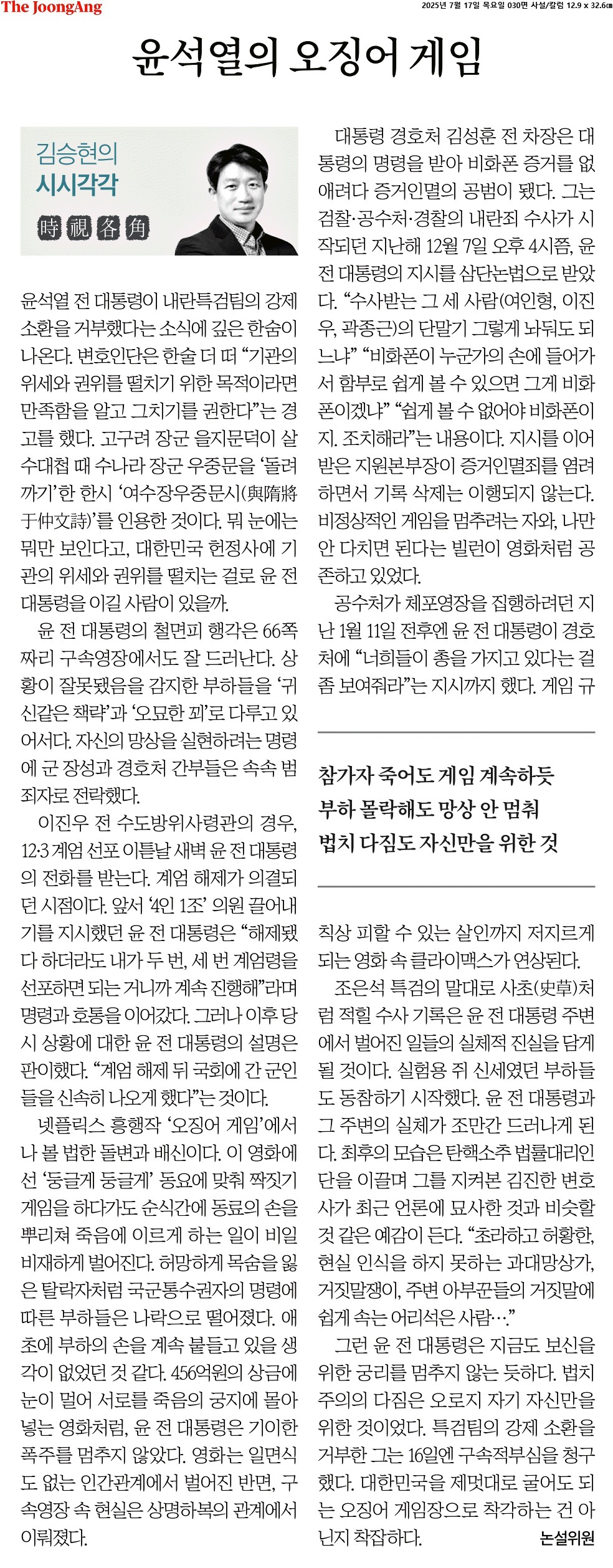③ 456억원의 상금에 눈이 멀어 서로를 죽음의 궁지에 몰아넣는 영화처럼, 윤 전 대통령은 기이한 폭주를 멈추지 않았다. 영화는 일면식도 없는 인간관계에서 벌어진 반면, 구속영장 속 현실은 상명하복의 관계에서 이뤄졌다.