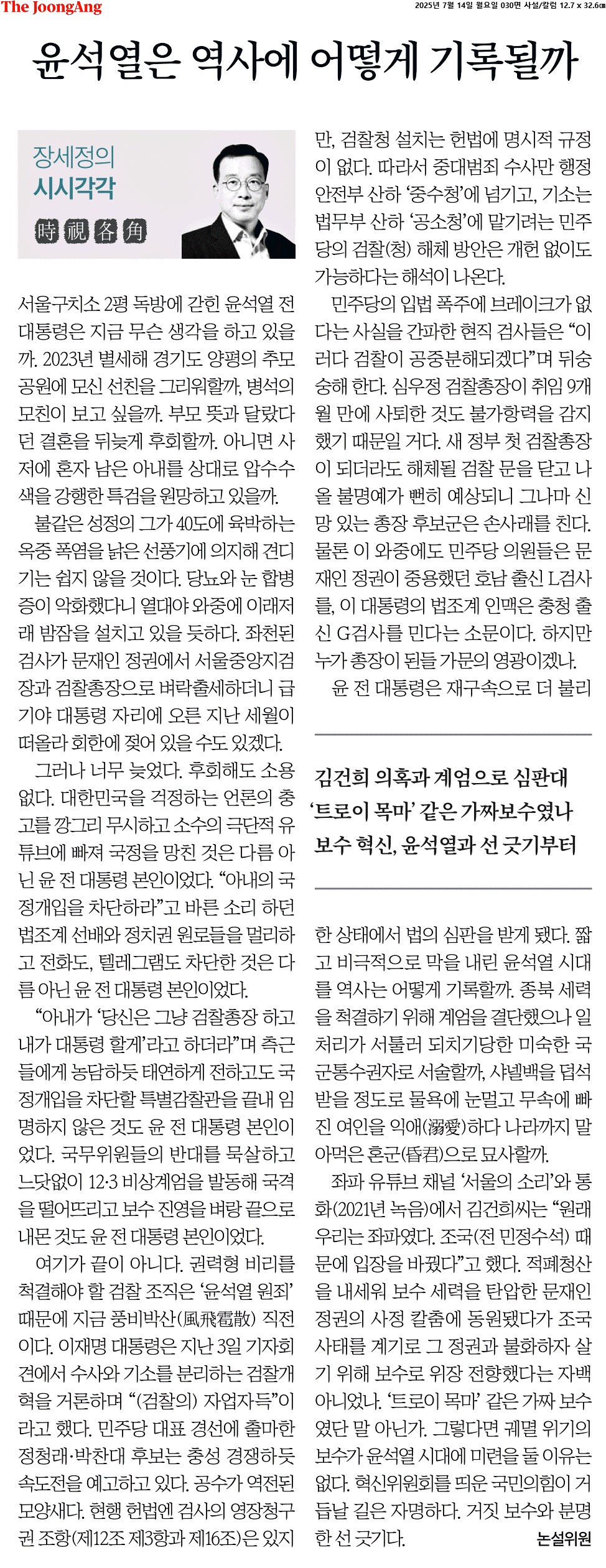 ③ 여기가 끝이 아니다. 권력형 비리를 척결해야 할 검찰 조직은 '윤석열 원죄' 때문에 지금 풍비박산(風飛雹散) 직전이다. 이재명 대통령은 지난 3일 기자회견에서 수사와 기소를 분리하는 검찰개혁을 거론하며 “(검찰의) 자업자득”이라고 했다.