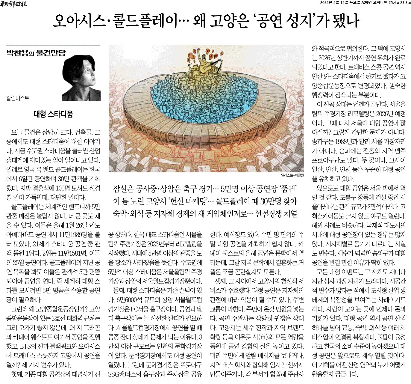 ④ 셋째. 그 사이에서 고양시의 헌신적 서비스가 주효했다. 대형 공연은 지자체의 관점에 따라 악몽이 될 수도 있다. 주변 교통이 막힌다. 주민이 온갖 민원을 넣는다. 공연 주관사는 상당히 귀찮은 상대다. 고양시는 세수 진작과 지역 브랜드 확립 등을 이유로 시(市)의 모든 역량을 동원해 공연 경험의 질을 높이고 있다. 미리 주민에게 알람 메시지를 보내거나, 지역 버스 회사와 합의해 임시 노선까지 만들어주거나, 각 부서가 협업해 주관사와 적극적으로 협의한다. 그 덕에 고양시는 2026년 상반기까지 공연 유치가 완료되었다고 한다.