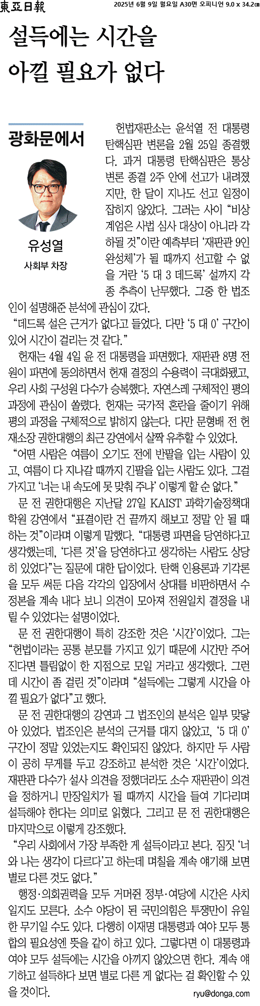 행정·의회권력을 모두 거머쥔 정부·여당에 시간은 사치일지도 모른다. 소수 야당이 된 국민의힘은 투쟁만이 유일한 무기일 수도 있다. 다행히 이재명 대통령과 여야 모두 통합의 필요성엔 뜻을 같이 하고 있다. 그렇다면 이 대통령과 여야 모두 설득에는 시간을 아끼지 않았으면 한다. 계속 얘기하고 설득하다 보면 별로 다른 게 없다는 걸 확인할 수 있을 것이다.