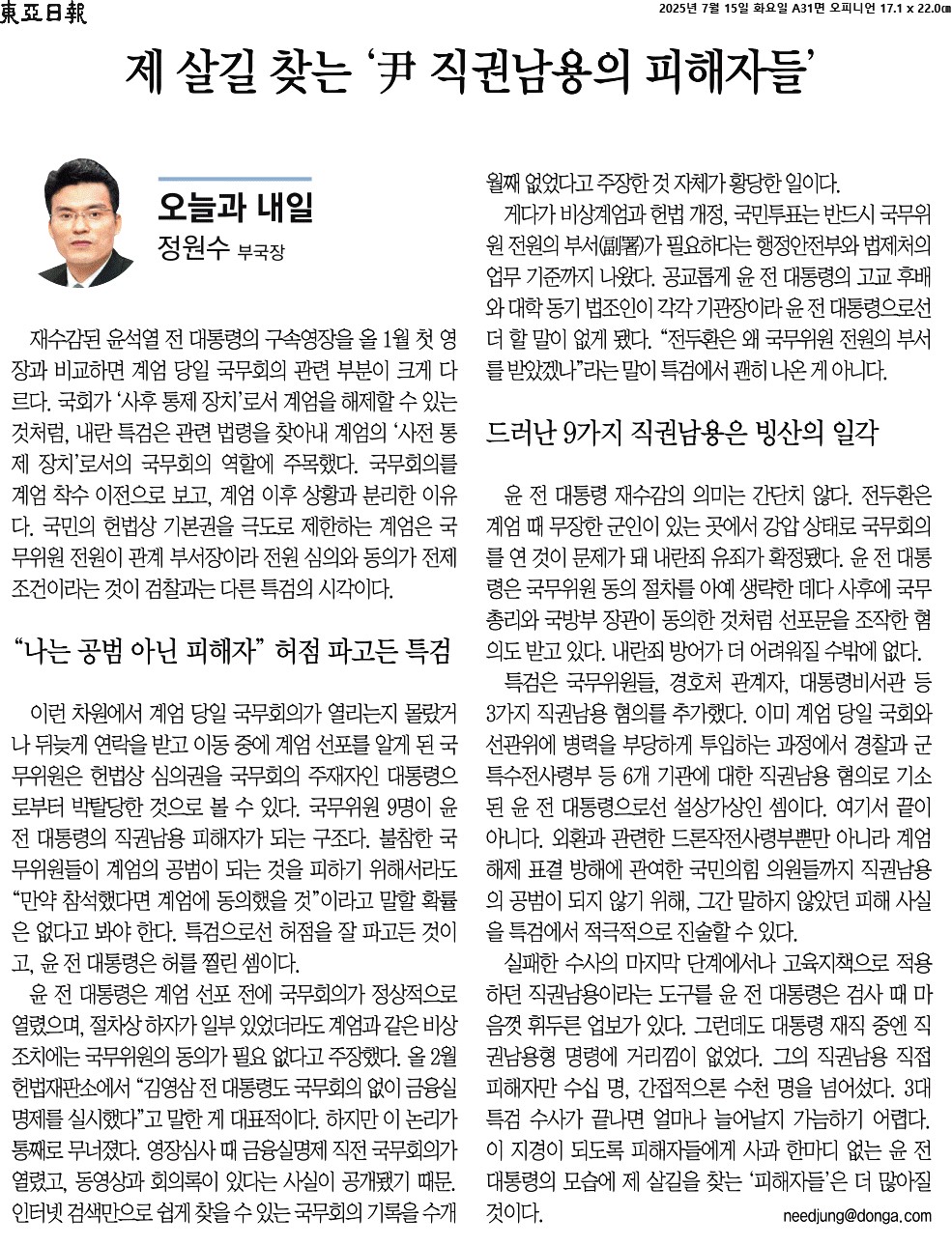⑤ 실패한 수사의 마지막 단계에서나 고육지책으로 적용하던 직권남용이라는 도구를 윤 전 대통령은 검사 때 마음껏 휘두른 업보가 있다. 그런데도 대통령 재직 중엔 직권남용형 명령에 거리낌이 없었다. 그의 직권남용 직접 피해자만 수십 명, 간접적으론 수천 명을 넘어섰다. 3대 특검 수사가 끝나면 얼마나 늘어날지 가늠하기 어렵다. 이 지경이 되도록 피해자들에게 사과 한마디 없는 윤 전 대통령의 모습에 제 살길을 찾는 ‘피해자들’은 더 많아질 것이다.