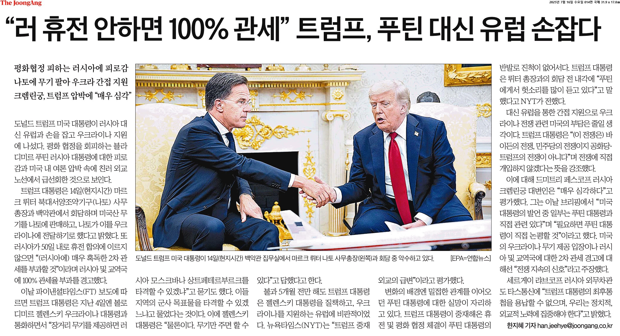 ② 트럼프 대통령은 14일(현지시간) 마르크 뤼터 북대서양조약기구(나토) 사무총장과 백악관에서 회담하며 미국산 무기를 나토에 판매하고, 나토가 이를 우크라이나에 전달하기로 했다고 밝혔다. 또 러시아가 50일 내로 휴전 합의에 이르지 않으면 “(러시아에) 매우 혹독한 2차 관세를 부과할 것”이라며 러시아 및 교역국에 100% 관세율 부과를 경고했다.