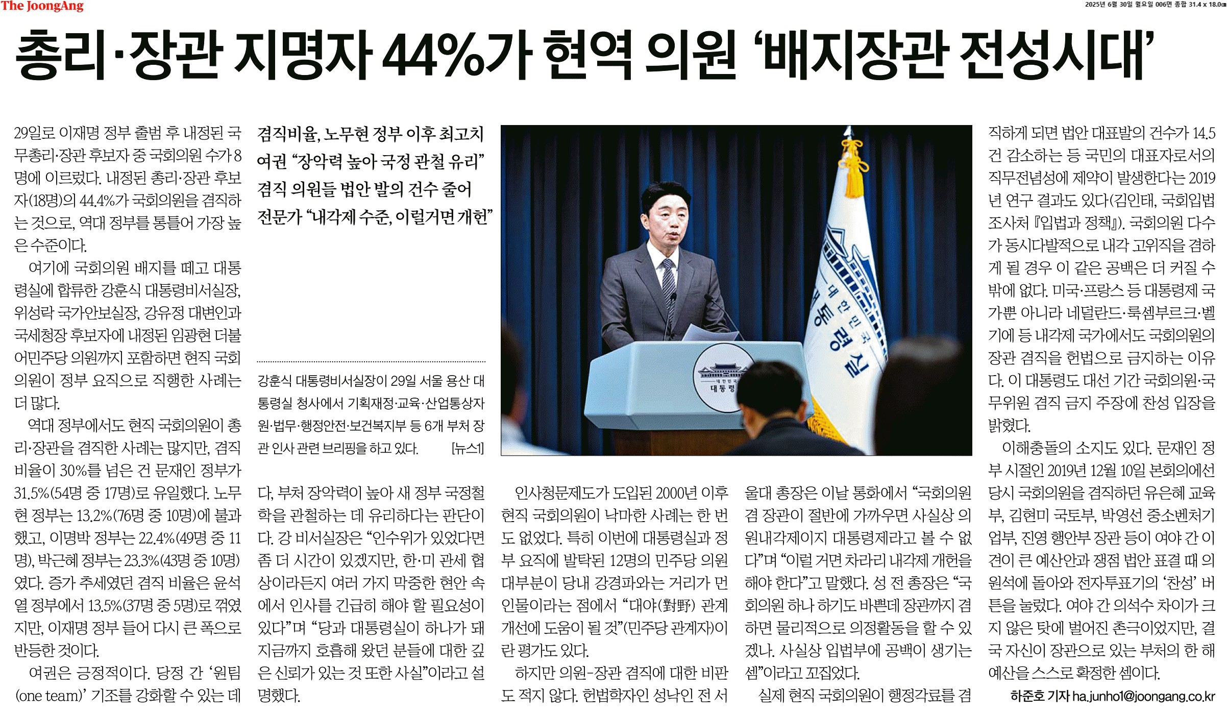 ① 이재명 정부 출범 후 내정된 국무총리·장관 후보자 중 국회의원 수가 8명(김민석 국무총리, 강선우 여성가족부, 김성환 환경부, 안규백 국방부, 윤호중 행정안전부, 전재수 해양수산부, 정동영 통일부, 정성호 법무부 장관 후보자)에 이르렀다. 29일 현재 내정된 총리·장관 후보자(18명)의 44.4%가 국회의원을 겸직하는 것으로, 이는 역대 정부를 통틀어 가장 높은 수준이다.