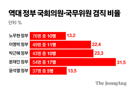 ② 역대 정부에서도 현직 국회의원이 총리·장관을 겸직한 사례는 많지만, 겸직 비율이 30%를 넘은 건 문재인 정부가 31.5%(54명 중 17명)로 유일했다. 노무현 정부는 13.2%(76명 중 10명)에 불과했고, 이명박 정부는 22.4%(49명 중 11명), 박근혜 정부는 23.3%(43명 중 10명)였다. 증가 추세였던 겸직 비율은 윤석열 정부에서 13.5%(37명 중 5명)로 꺾였지만, 이재명 정부 들어 다시 큰 폭으로 반등한 것이다.