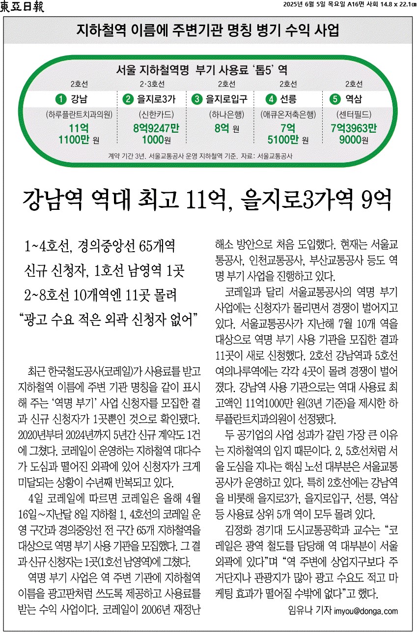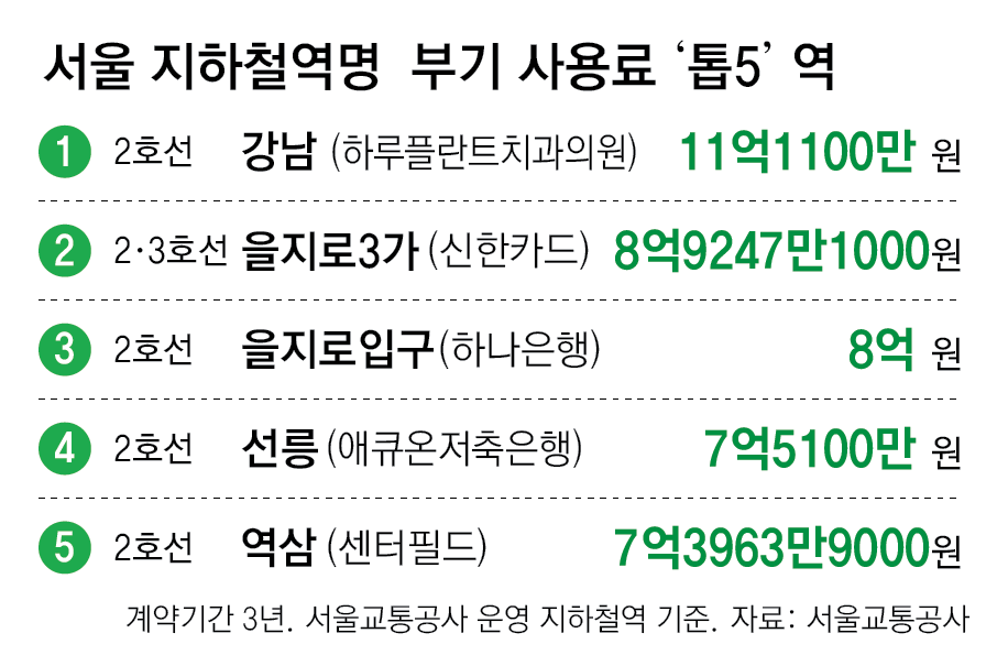 ③ 코레일과 달리 서울교통공사의 역명 부기 사업에는 신청자가 몰리면서 경쟁이 벌어지고 있다. 서울교통공사가 지난해 7월 10개 역을 대상으로 역명 부기 사용 기관을 모집한 결과 11곳이 새로 신청했다. 2호선 강남역과 5호선 여의나루역에는 각각 4곳이 몰려 경쟁이 벌어졌다. 강남역 사용 기관으로는 역대 사용료 최고액인 11억1000만 원(3년 기준)을 제시한 하루플란트치과의원이 선정됐다.