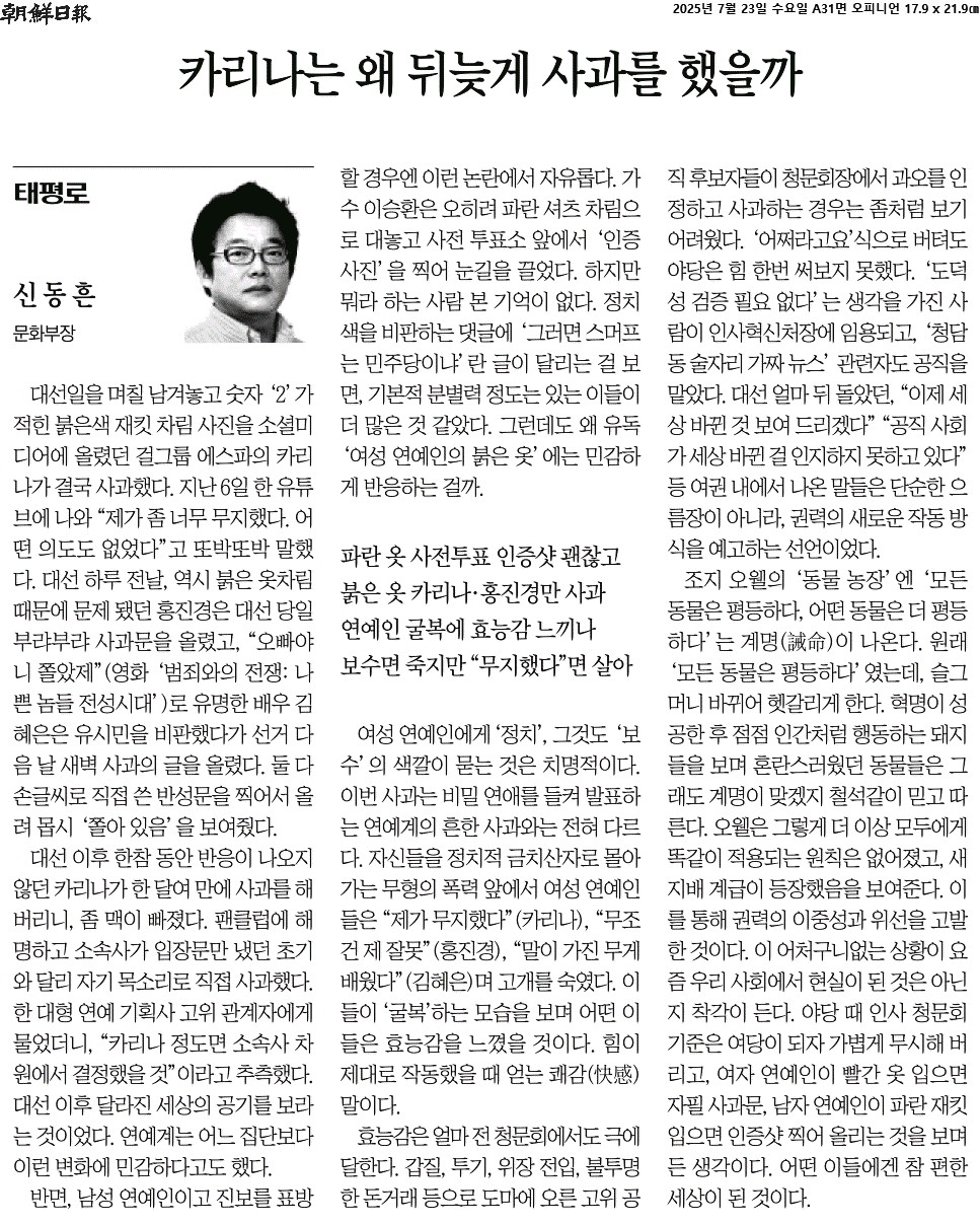 ② 한 대형 연예 기획사 고위 관계자에게 물었더니, “카리나 정도면 소속사 차원에서 결정했을 것”이라고 추측했다. 대선 이후 달라진 세상의 공기를 보라는 것이었다. 연예계는 어느 집단보다 이런 변화에 민감하다고도 했다.