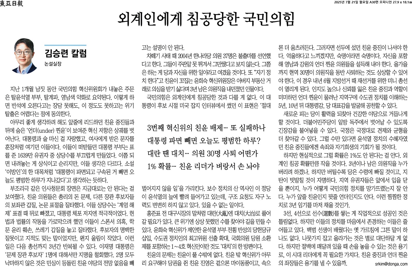 ① 지난 1개월 남짓 동안 국민의힘 혁신위원회가 내놓은 주문은 탈윤석열 부부, 탈계파, 영남색 약화로 요약된다. 이렇게 하면 반석에 오른다고는 장담 못해도, 이 정도도 못하고는 위기탈출은 어렵다는 점에 동의한다.