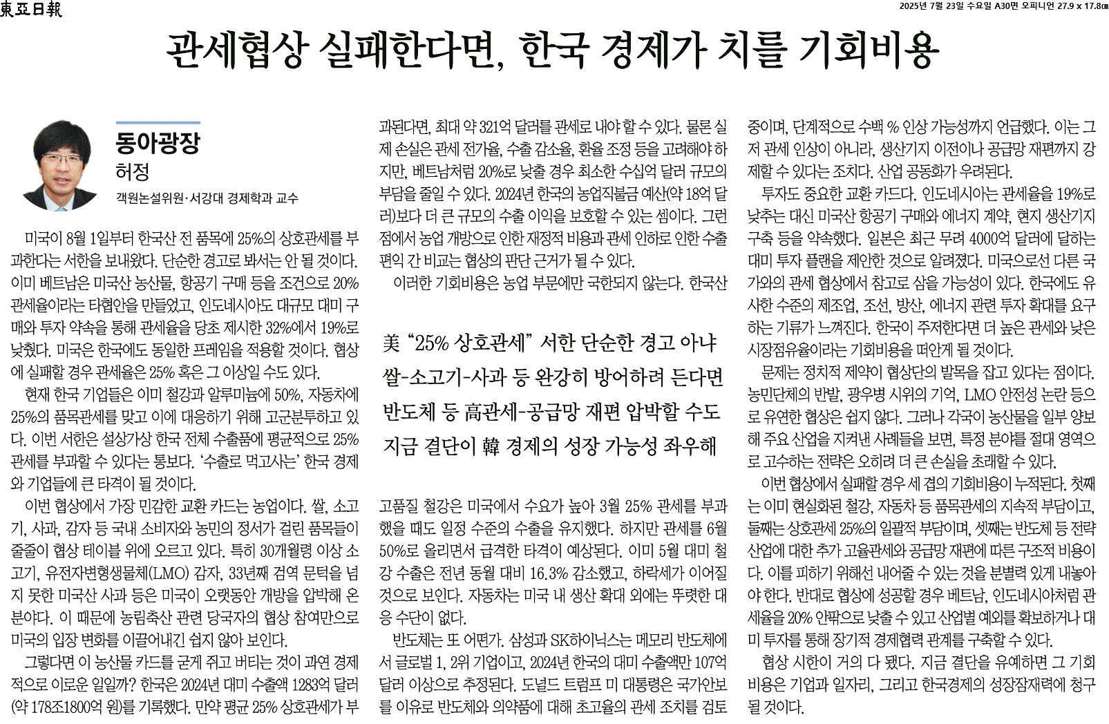② 현재 한국 기업들은 이미 철강과 알루미늄에 50%, 자동차에 25%의 품목관세를 맞고 이에 대응하기 위해 고군분투하고 있다. 이번 서한은 설상가상 한국 전체 수출품에 평균적으로 25% 관세를 부과할 수 있다는 통보다. ‘수출로 먹고사는’ 한국 경제와 기업들에 큰 타격이 될 것이다.