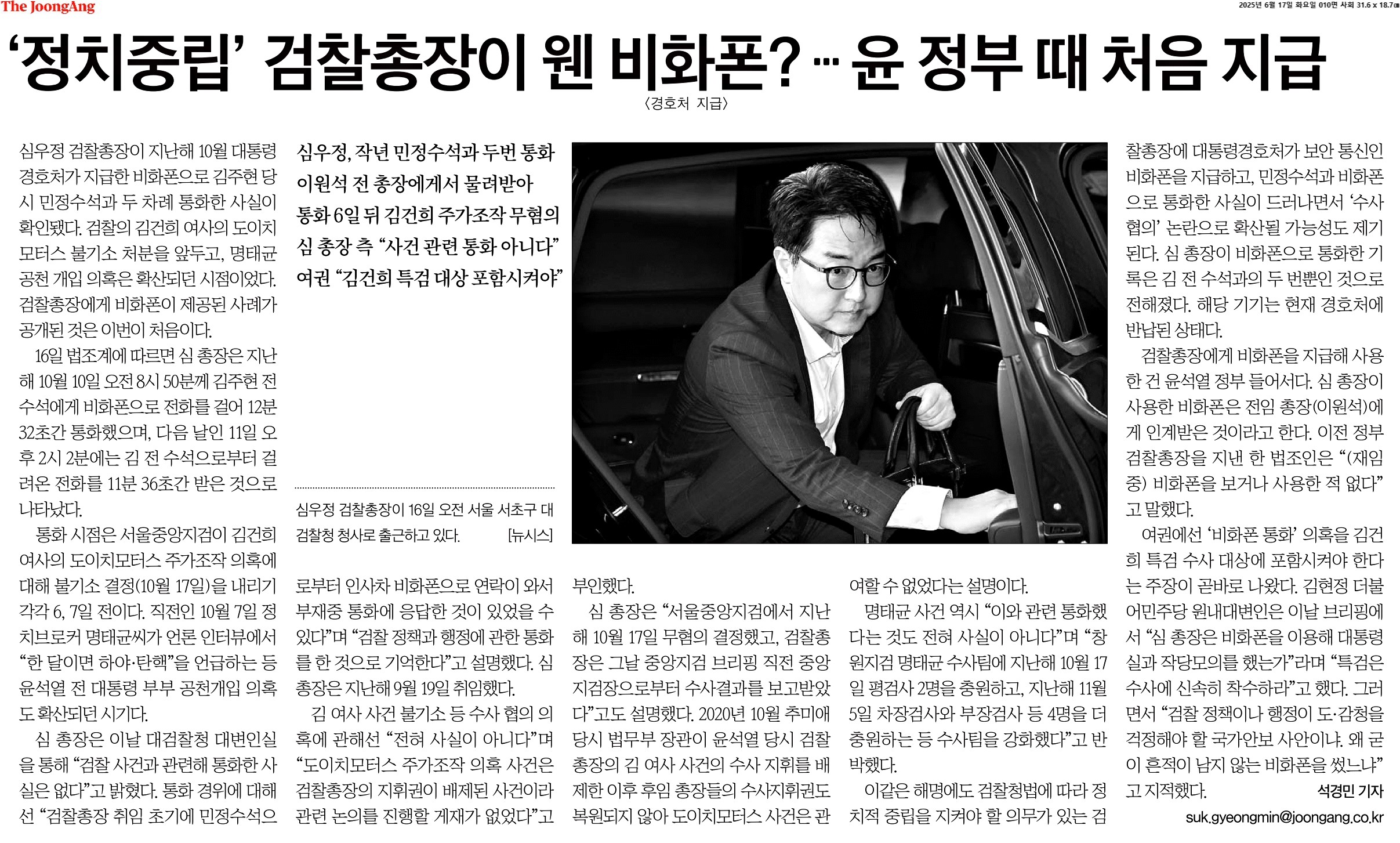 ① 심우정 검찰총장이 지난해 10월 대통령경호처가 지급한 비화폰으로 김주현 당시 민정수석과 두 차례 통화한 사실이 확인됐다. 검찰의 김건희 여사의 도이치모터스 불기소 처분을 앞두고, 명태균 공천 개입 의혹은 확산되던 시점이었다. 검찰총장에게 비화폰이 제공된 사례가 공개된 것은 이번이 처음이다.