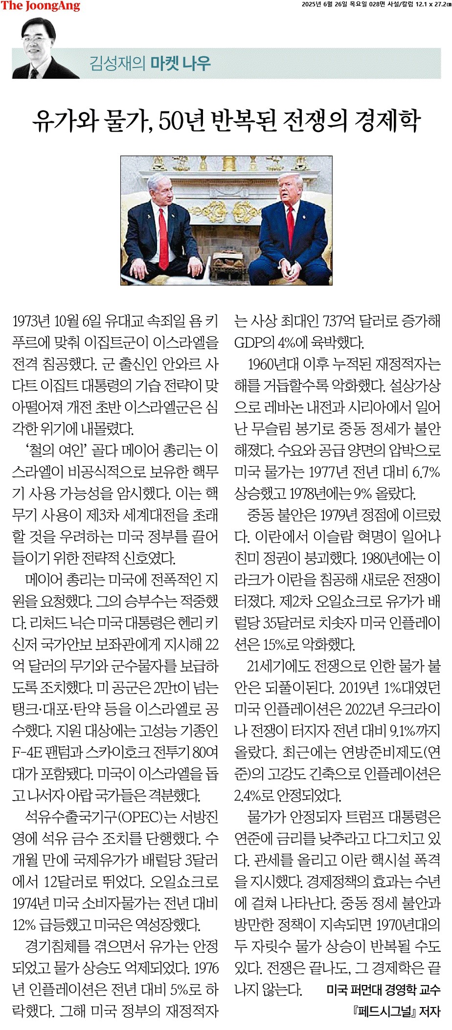 ⑤ 물가가 안정되자 트럼프 대통령은 연준에 금리를 낮추라고 다그치고 있다. 관세를 올리고 이란 핵시설 폭격을 지시했다. 경제정책의 효과는 수년에 걸쳐 나타난다. 중동 정세 불안과 방만한 정책이 지속되면 1970년대의 두 자릿수 물가 상승이 반복될 수도 있다. 전쟁은 끝나도, 그 경제학은 끝나지 않는다.