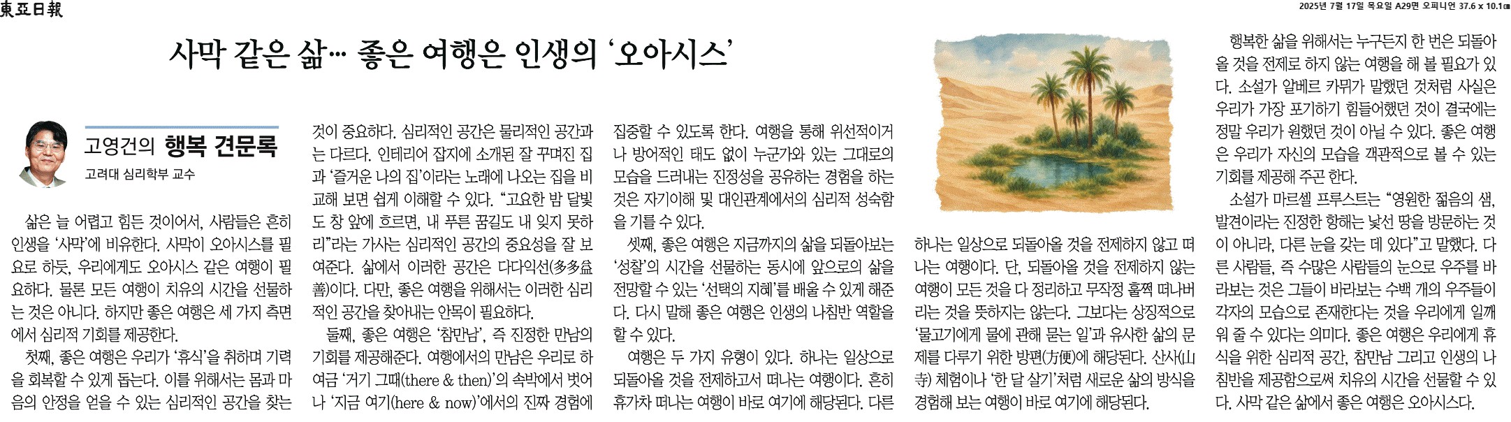 ① 삶은 늘 어렵고 힘든 것이어서, 사람들은 흔히 인생을 ‘사막’에 비유한다. 사막이 오아시스를 필요로 하듯, 우리에게도 오아시스 같은 여행이 필요하다. 물론 모든 여행이 치유의 시간을 선물하는 것은 아니다. 하지만 좋은 여행은 세 가지 측면에서 심리적 기회를 제공한다.