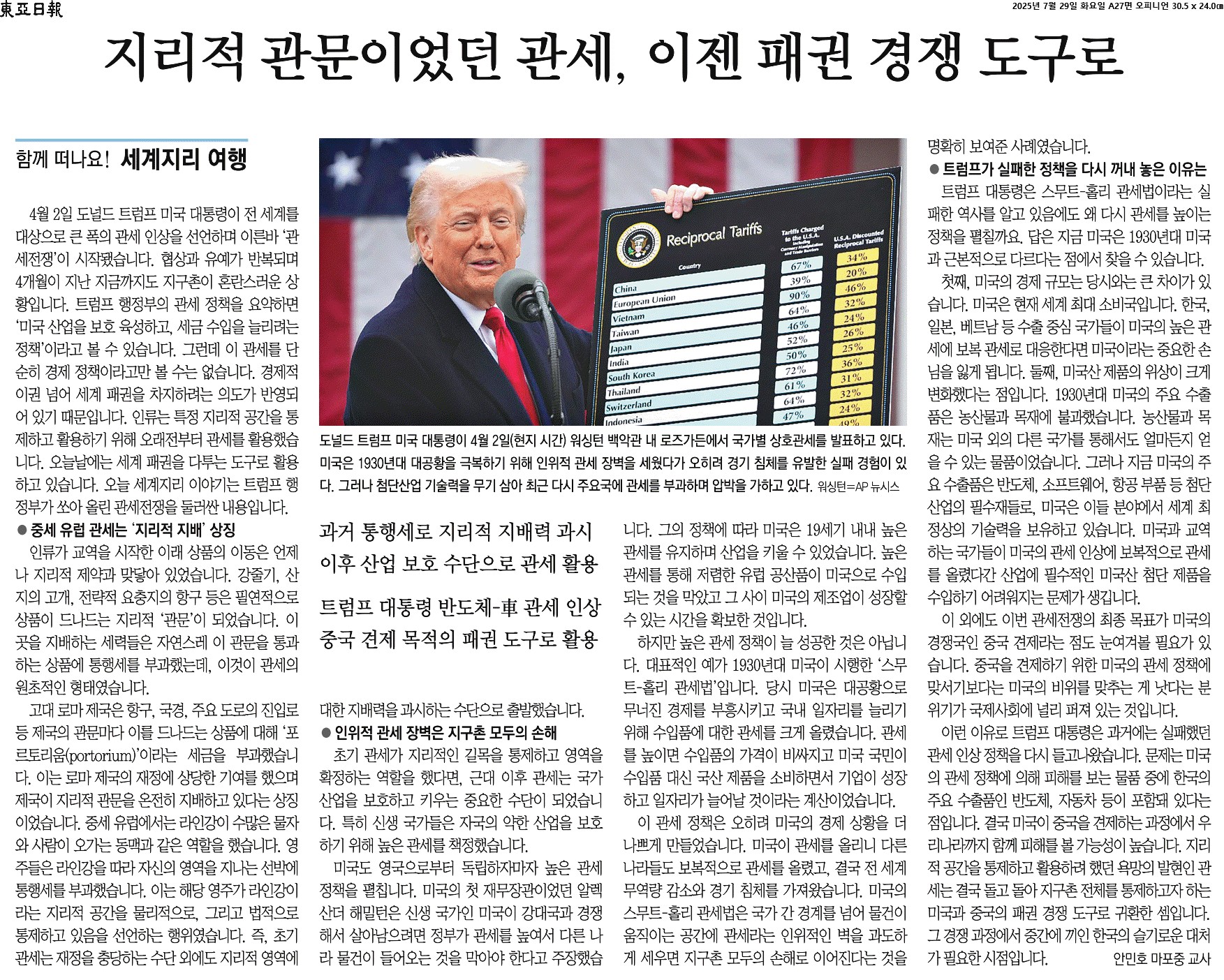 ⑤ 지리적 공간을 통제하고 활용하려 했던 욕망의 발현인 관세는 결국 돌고 돌아 지구촌 전체를 통제하고자 하는 미국과 중국의 패권 경쟁 도구로 귀환한 셈입니다. 그 경쟁 과정에서 중간에 끼인 한국의 슬기로운 대처가 필요한 시점입니다.