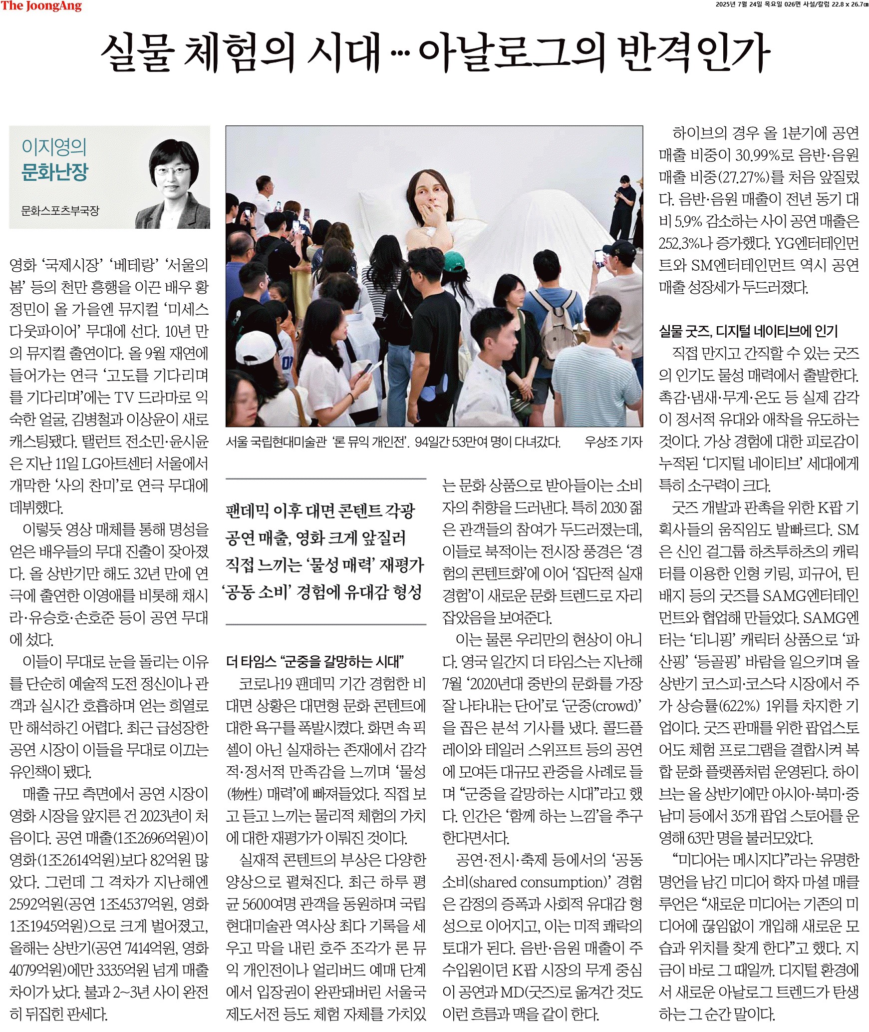 ② 코로나19 팬데믹 기간 경험한 비대면 상황은 대면형 문화 콘텐트에 대한 욕구를 폭발시켰다. 화면 속 픽셀이 아닌 실재하는 존재에서 감각적·정서적 만족감을 느끼며 ‘물성(物性) 매력’에 빠져들었다. 직접 보고 듣고 느끼는 물리적 체험의 가치에 대한 재평가가 이뤄진 것이다.