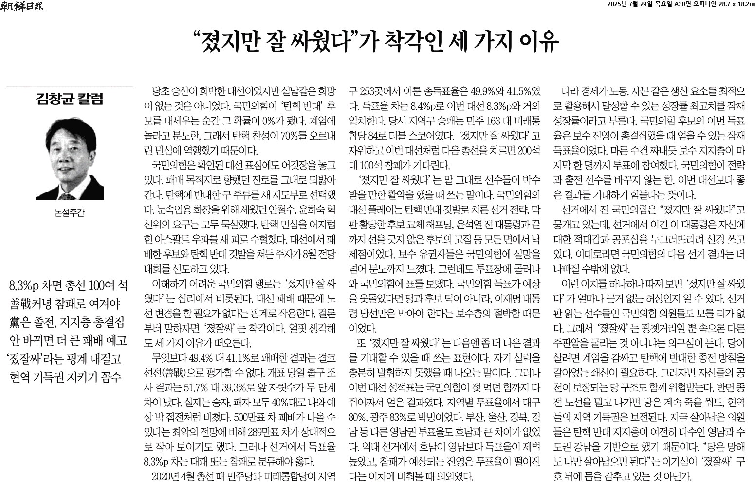④ ‘졌지만 잘 싸웠다’는 말 그대로 선수들이 박수 받을 만한 활약을 했을 때 쓰는 말이다. 국민의힘의 대선 플레이는 탄핵 반대 깃발로 치른 선거 전략, 막판 황당한 후보 교체 해프닝, 윤석열 전 대통령과 끝까지 선을 긋지 않은 후보의 고집 등 모든 면에서 낙제점이었다. 보수 유권자들은 국민의힘에 실망을 넘어 분노까지 느꼈다. 그런데도 투표장에 몰려나와 국민의힘에 표를 보탰다.