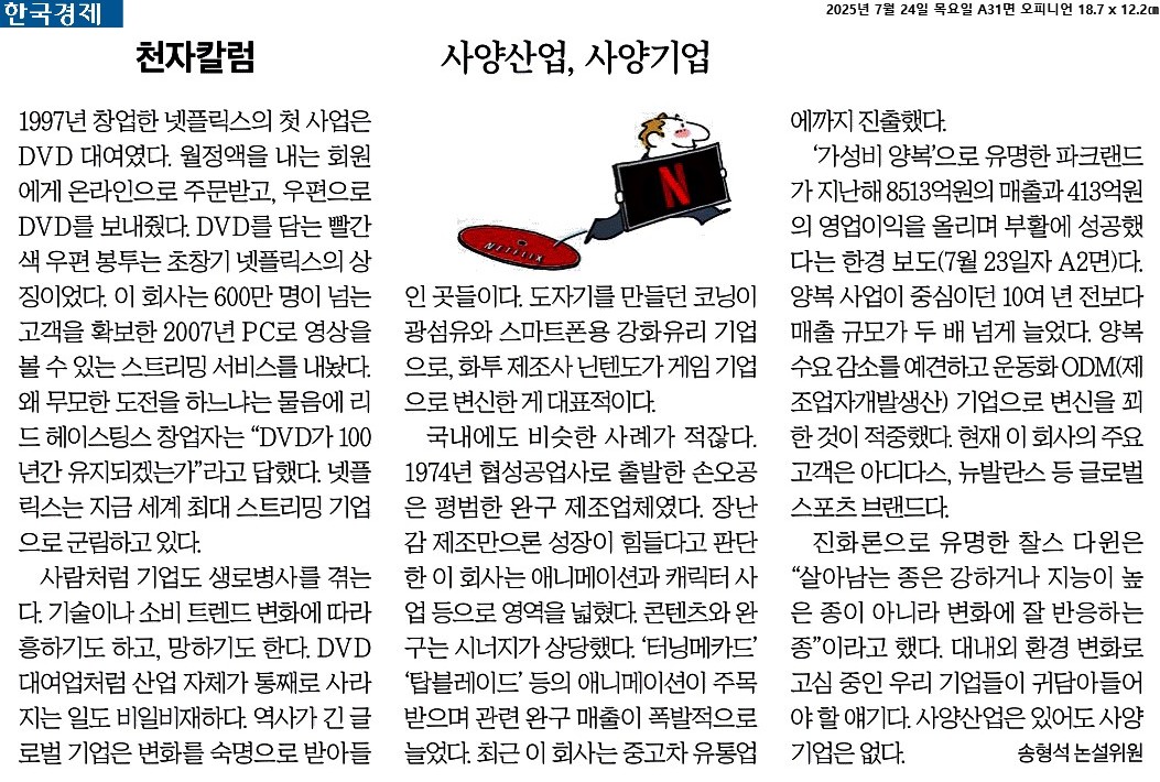 ④ ‘가성비 양복’으로 유명한 파크랜드가 지난해 8513억원의 매출과 413억원의 영업이익을 올리며 부활에 성공했다는 한경 보도(7월 23일자 A2면)다. 양복 사업이 중심이던 10여 년 전보다 매출 규모가 두 배 넘게 늘었다. 양복 수요 감소를 예견하고 운동화 ODM(제조업자개발생산) 기업으로 변신을 꾀한 것이 적중했다.