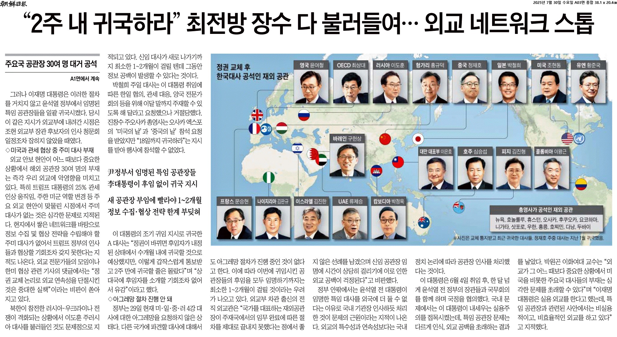 ③ 정부의 한 소식통은 “이재명 대통령이 윤석열 정부에서 임명된 특임 대사들의 조기 귀국을 지시했다”며 “외교부는 중요한 시기에 대사들의 공석을 우려했지만, 이를 따를 수밖에 없었다”고 했다. 통상 정권이 바뀔 경우, 신임 대통령은 전 정권이 임명한 특임 대사들의 교체를 위해 후임자의 아그레망(임명 동의)을 신청한 뒤 순차적으로 교체해 왔다. 따라서 정권 교체기에도 4강 대사가 한꺼번에 동시 공석인 경우는 없었다.