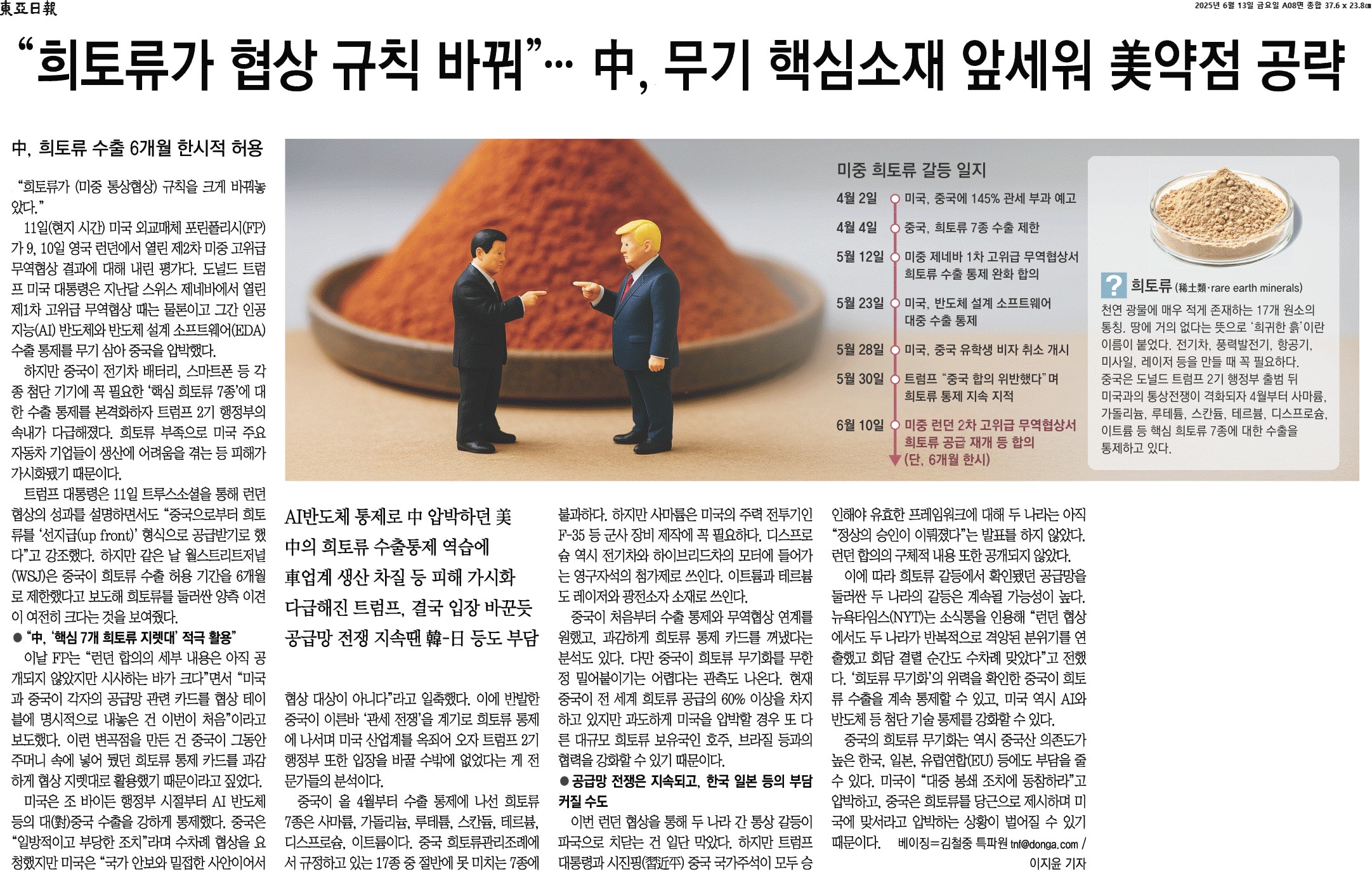⑤ 이날 FP는 “런던 합의의 세부 내용은 아직 공개되지 않았지만 시사하는 바가 크다”면서 “미국과 중국이 각자의 공급망 관련 카드를 협상 테이블에 명시적으로 내놓은 건 이번이 처음”이라고 보도했다. 이런 변곡점을 만든 건 중국이 그동안 주머니 속에 넣어 뒀던 희토류 통제 카드를 과감하게 협상 지렛대로 활용했기 때문이라고 짚었다.