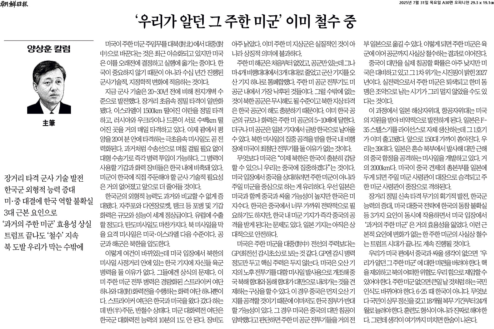 ② 이렇게 여건이 바뀌었는데 미국 입장에서 북한의 미사일 사정거리 안에 있는 한국 기지에 자신들 육군 병력을 둘 이유가 없다. 그들에겐 상식의 문제다.