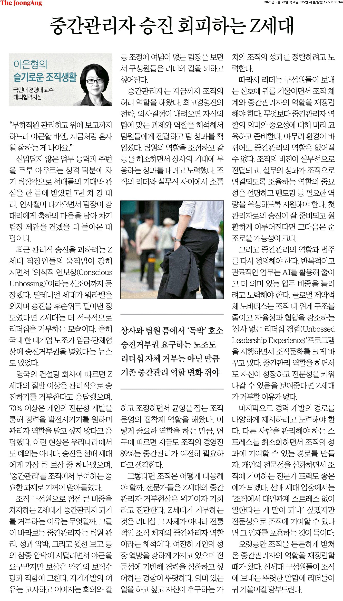 ② 최근 관리직 승진을 피하려는 Z세대 직장인들의 움직임이 강해지면서 ‘의식적 언보싱(Conscious Unbossing)’이라는 신조어까지 등장했다. 밀레니얼 세대가 워라밸을 외치며 승진을 후순위로 밀어낸 정도였다면 Z세대는 더 적극적으로 리더십을 거부하는 모습이다.