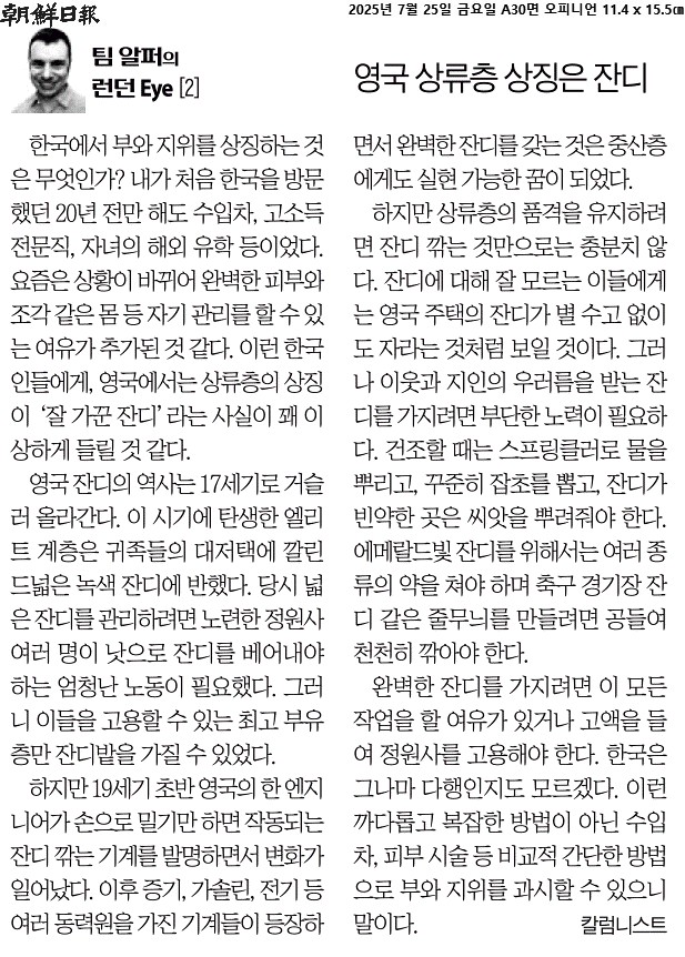 ① 한국에서 부와 지위를 상징하는 것은 무엇인가? 내가 처음 한국을 방문했던 20년 전만 해도 수입차, 고소득 전문직, 자녀의 해외 유학 등이었다. 요즘은 상황이 바뀌어 완벽한 피부와 조각 같은 몸 등 자기 관리를 할 수 있는 여유가 추가된 것 같다. 이런 한국인들에게 영국에서는 상류층의 상징이 ‘잘 가꾼 잔디’라는 사실이 꽤 이상하게 들릴 것 같다.