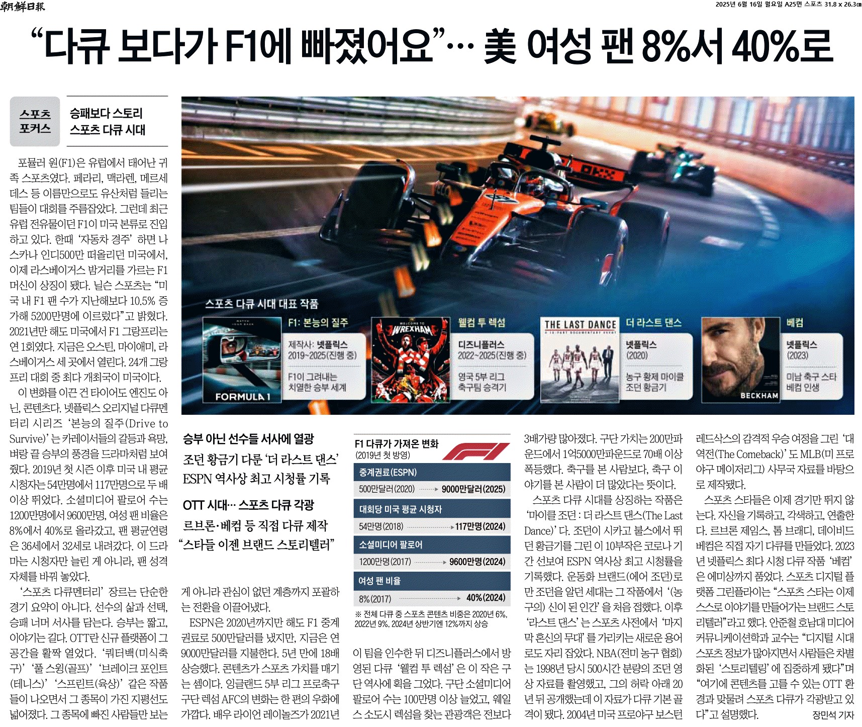 ④ ESPN은 2020년까지만 해도 F1 중계권료로 500만달러를 냈지만, 지금은 연 9000만달러를 지불한다. 5년 만에 18배 상승했다. 콘텐츠가 스포츠 가치를 매기는 셈이다.