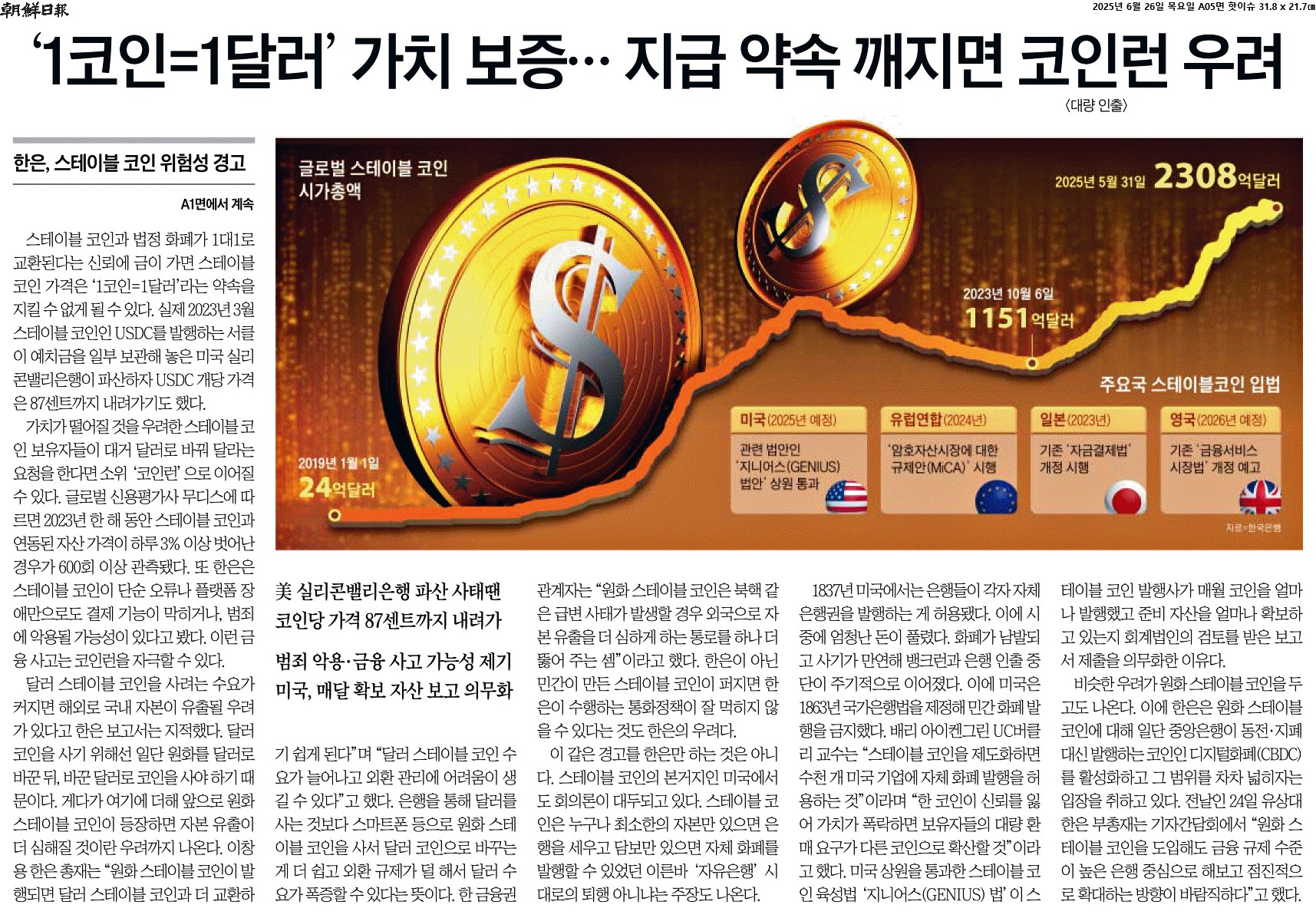 ① ‘1코인=1달러’ ‘1코인=1000원’처럼 법정 화폐와 연동하게 설계된 스테이블 코인에 대해 한국은행이 25일 금융안정보고서를 내고 “금융 안정과 경제 전반에 잠재적 리스크(위험) 요인이 될 수 있다”며 경고하고 나섰다. 한은은 “코인런(대량 인출), 금융 사고, 자본 유출, 통화 정책 유효성 저해 등이 우려된다”고 했다.