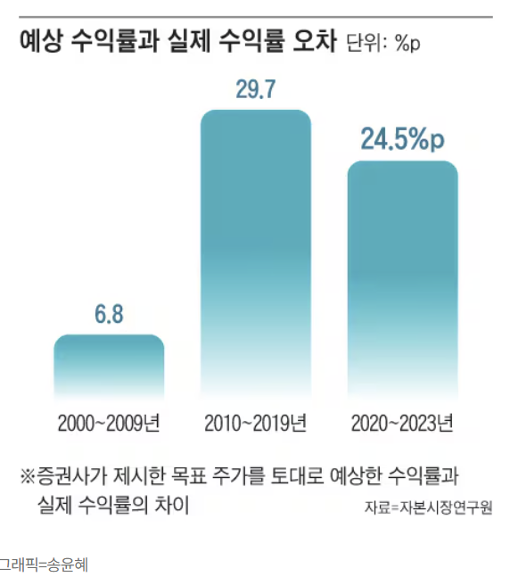 ④ 2000~2009년엔 예측 오차가 6.8%포인트였다. 하지만 2010~2019년엔 오차가 29.7%포인트로 급격히 커졌다. 2020~2023년에는 24.5%포인트로 다소 줄었지만, 코로나 영향으로 주가가 급등한 2020년을 제외하고 나면 오차는 39.7%포인트로 벌어졌다. 시간이 갈수록 증권사가 제시한 목표 주가와 그 종목의 주가 상승률 격차가 심해진다는 뜻이다.