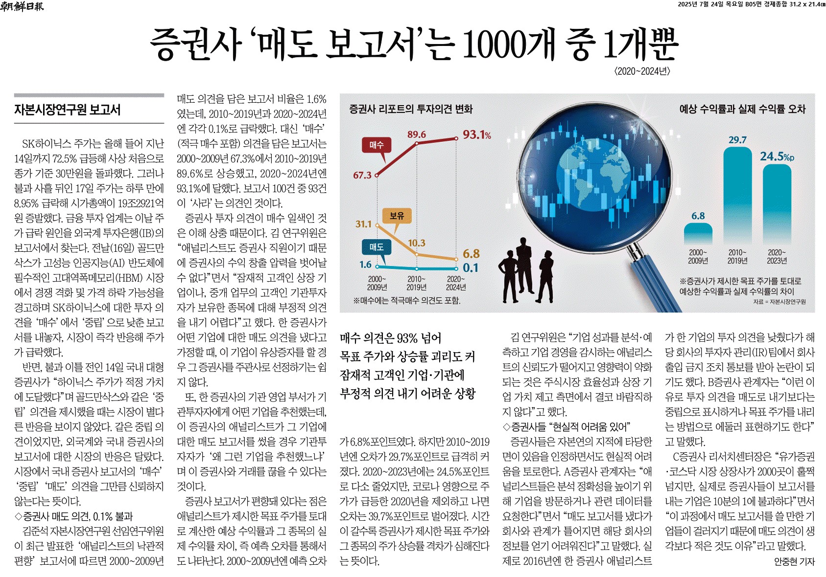 ② 김준석 자본시장연구원 선임연구위원이 최근 발표한 ‘애널리스트의 낙관적 편향’ 보고서에 따르면 2000~2009년 매도 의견을 담은 보고서 비율은 1.6%였는데, 2010~2019년과 2020~2024년엔 각각 0.1%로 급락했다. 대신 ‘매수’(적극 매수 포함) 의견을 담은 보고서는 2000~2009년 67.3%에서 2010~2019년 89.6%로 상승했고, 2020~2024년엔 93.1%에 달했다. 보고서 100건 중 93건이 ‘사라’는 의견인 것이다.