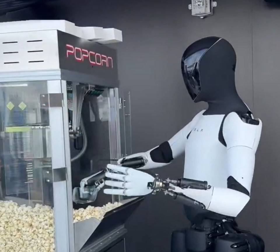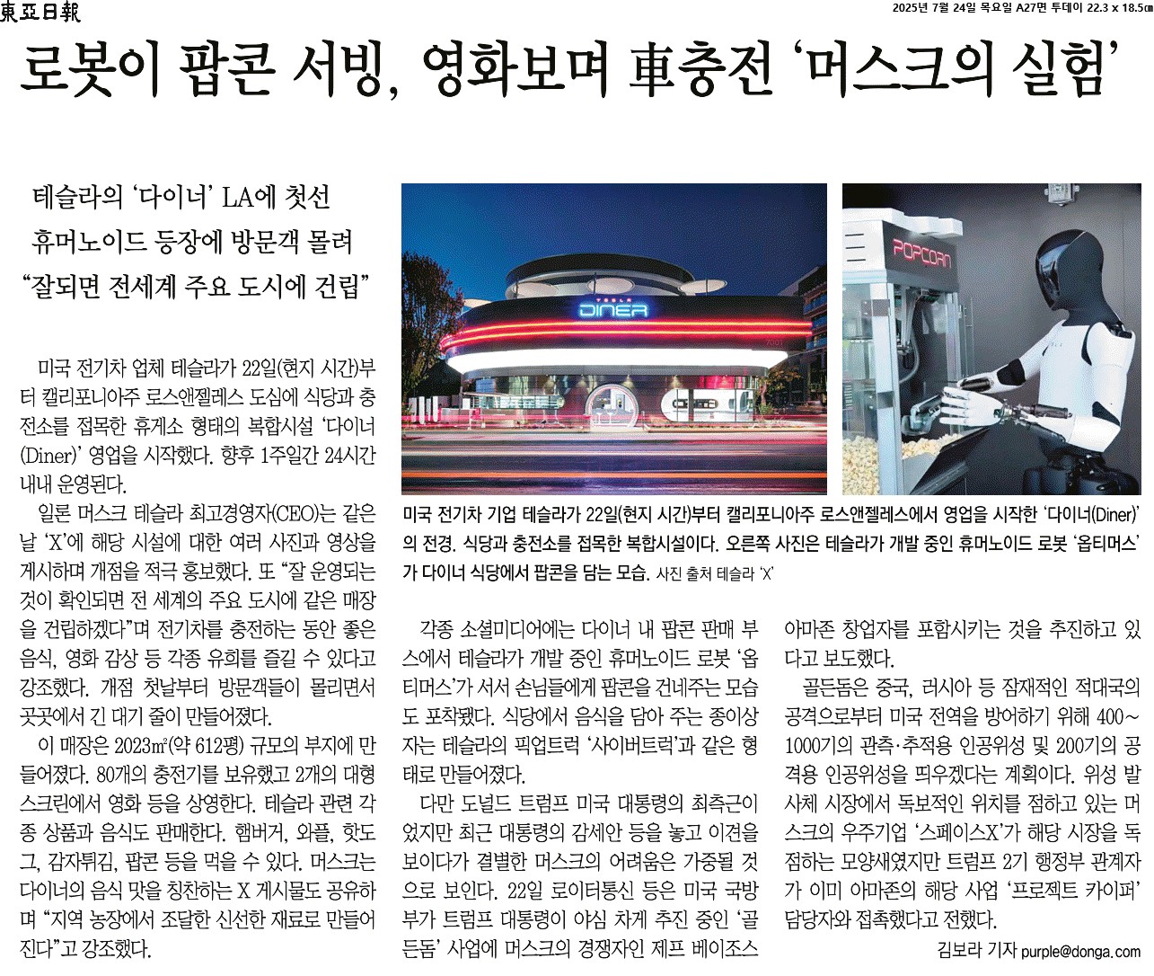 ③ 각종 소셜미디어에는 다이너 내 팝콘 판매 부스에서 테슬라가 개발 중인 휴머노이드 로봇 ‘옵티머스’가 서서 손님들에게 팝콘을 건네주는 모습도 포착됐다. 식당에서 음식을 담아 주는 종이상자는 테슬라의 픽업트럭 ‘사이버트럭’과 같은 형태로 만들어졌다.