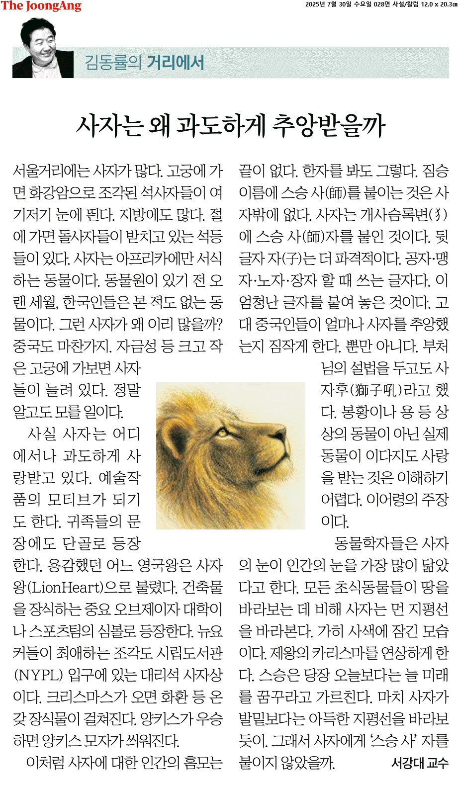 ③ 짐승 이름에 스승 사(師)를 붙이는 것은 사자밖에 없다. 사자는 개사슴록변(犭)에 스승 사(師)자를 붙인 것이다. 뒷글자 자(子)는 더 파격적이다. 공자·맹자·노자·장자 할 때 쓰는 글자다. 이 엄청난 글자를 붙여 놓은 것이다. 고대 중국인들이 얼마나 사자를 추앙했는지 짐작게 한다. 뿐만 아니다. 부처님의 설법을 두고도 사자후(獅子吼)라고 했다.