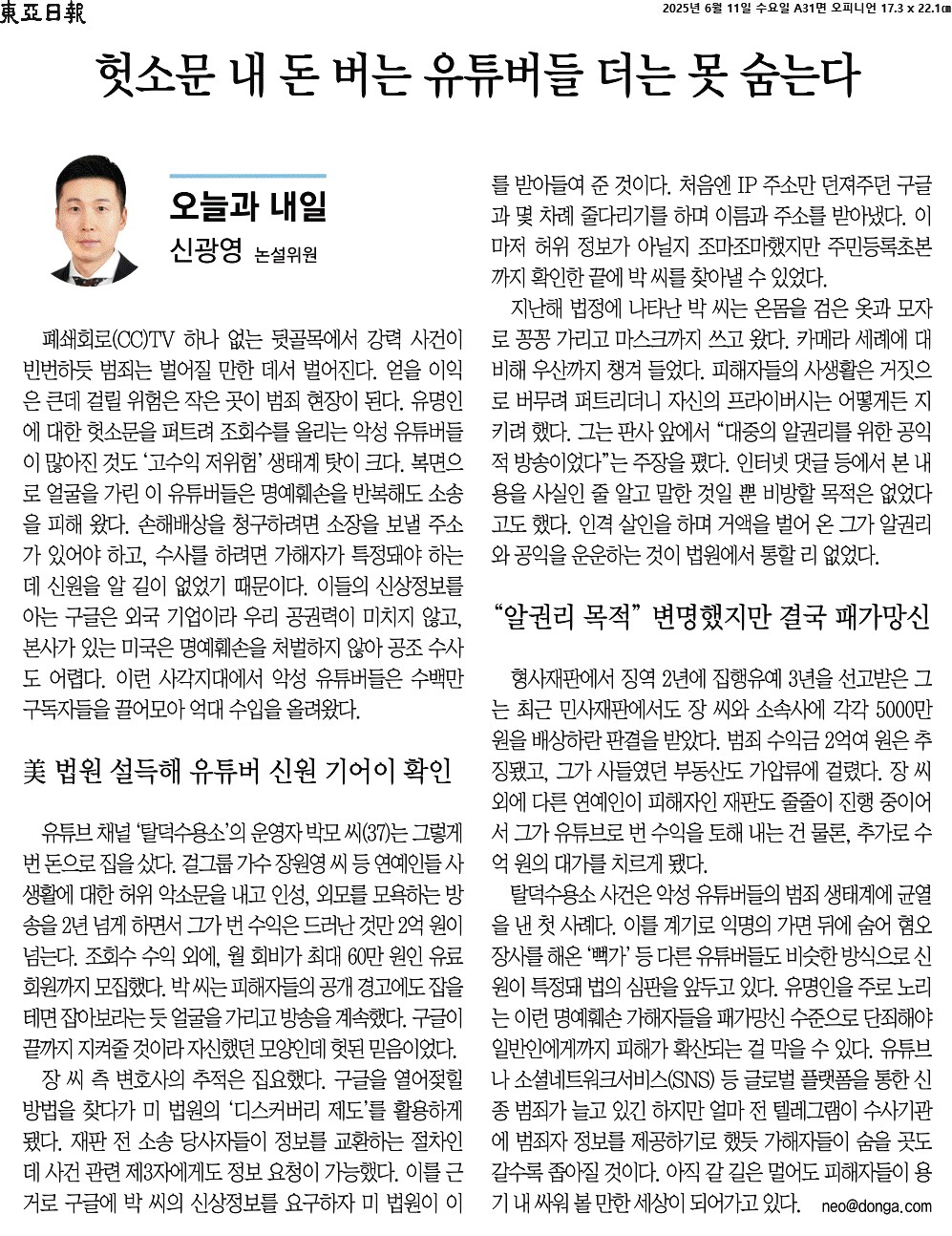 ① 유명인에 대한 헛소문을 퍼트려 조회수를 올리는 악성 유튜버들이 많아진 것도 ‘고수익 저위험’ 생태계 탓이 크다. 복면으로 얼굴을 가린 이 유튜버들은 명예훼손을 반복해도 소송을 피해 왔다. 손해배상을 청구하려면 소장을 보낼 주소가 있어야 하고, 수사를 하려면 가해자가 특정돼야 하는데 신원을 알 길이 없었기 때문이다. 이들의 신상정보를 아는 구글은 외국 기업이라 우리 공권력이 미치지 않고, 본사가 있는 미국은 명예훼손을 처벌하지 않아 공조 수사도 어렵다. 이런 사각지대에서 악성 유튜버들은 수백만 구독자들을 끌어모아 억대 수입을 올려왔다.