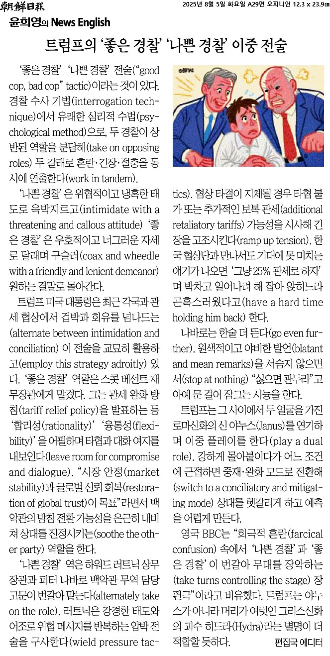 ③ 트럼프 미국 대통령은 최근 각국과 관세 협상에서 겁박과 회유를 넘나드는(alternate between intimidation and conciliation) 이 전술을 교묘히 활용하고(employ this strategy adroitly) 있다. ‘좋은 경찰’ 역할은 스콧 베선트 재무장관에게 맡겼다. 그는 관세 완화 방침(tariff relief policy)을 발표하는 등 ‘합리성(rationality)’ ‘융통성(flexibility)’을 어필하며 타협과 대화 여지를 내보인다(leave room for compromise and dialogue).