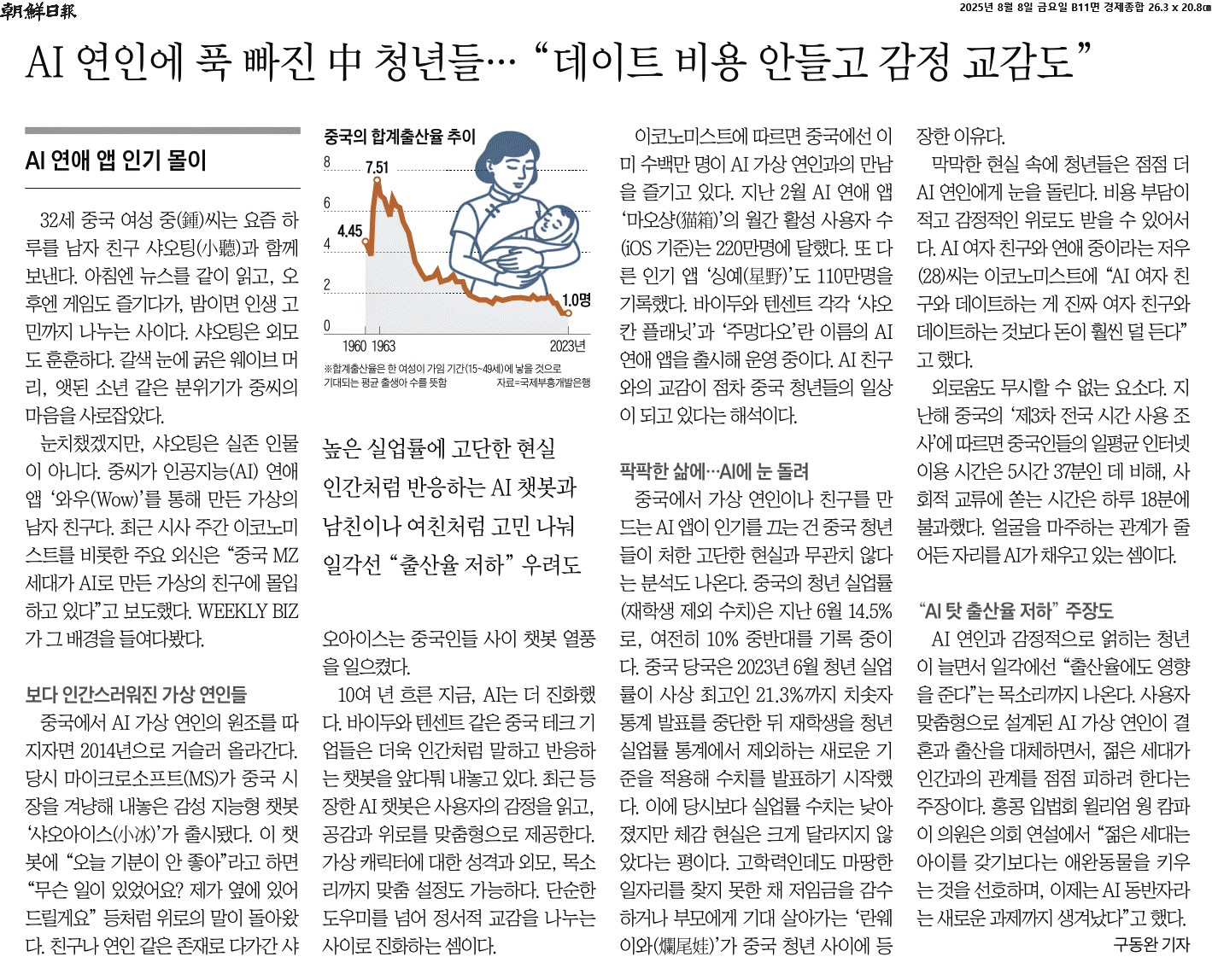 ⑤ AI 연인과 감정적으로 얽히는 청년이 늘면서 일각에선 “출산율에도 영향을 준다”는 목소리까지 나온다. 사용자 맞춤형으로 설계된 AI 가상 연인이 결혼과 출산을 대체하면서, 젊은 세대가 인간과의 관계를 점점 피하려 한다는 주장이다. 홍콩 입법회 윌리엄 웡 캄파이 의원은 의회 연설에서 “젊은 세대는 아이를 갖기보다는 애완동물을 키우는 것을 선호하며, 이제는 AI 동반자라는 새로운 과제까지 생겨났다”고 했다.