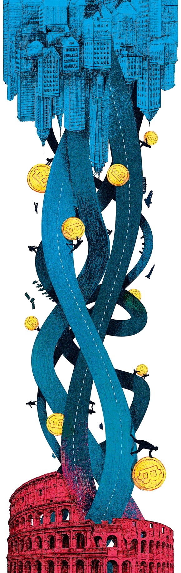 ② 이러한 문제점을 극복한 문명이 있다. 바로 로마 제국이다. 로마 제국을 대표하는 거대한 건축물은 콜로세움이다. 하지만 로마는 콜로세움을 수도 로마에만 두지 않았다. 같은 유형의 원형 경기장을 개발하는 모든 도시에 하나씩 건축했다. 그리고 이 도시들을 모두 도로로 연결했다. 네트워크를 만든 것이다. 이제 유럽인은 가는 도시마다 로마 제국에 대해 경외심을 가지게 됐다. 원형 경기장이라는 건축물 네트워크를 통해 유럽 전체를 통제권 안에 둔 셈이다. 하나의 건축물을 만드는 데 그치지 않고 ‘네트워크’를 만들었다는 점에서 로마 문명은 이전의 그리스나 이집트 문명과 다르다.