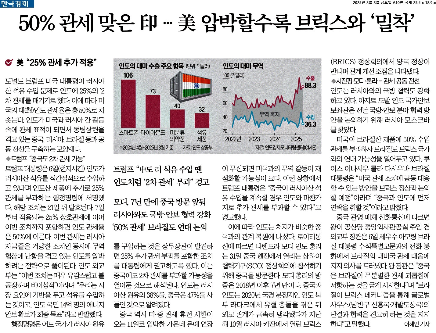② 트럼프 대통령은 6일(현지시간) 인도가 러시아산 석유를 직간접적으로 수입하고 있다며 인도산 제품에 추가로 25% 관세를 부과하는 행정명령에 서명했다. 해당 조치는 21일 뒤 발효된다. 7일부터 적용되는 25% 상호관세에 이어 이번 조치까지 포함하면 인도 관세율은 50%에 이른다. 이번 관세는 러시아 자금줄을 겨냥한 조치인 동시에 무역협상에 난항을 겪고 있는 인도를 압박하려는 전략으로 풀이된다.