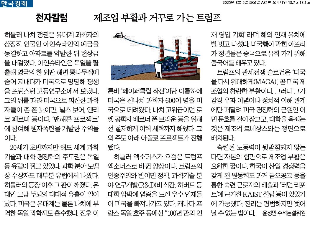 ④ 트럼프의 관세전쟁 슬로건은 ‘미국을 다시 위대하게(MAGA)’, 곧 미국 제조업의 찬란한 부활이다. 그러나 그가 강경 우파 이념이나 정치적 이해 관계에만 매달려 미국 경쟁력의 근원인 이민 문호를 걸어 잠그고, 대학을 옥죄는 것은 제조업 르네상스와는 정면으로 배치된다.