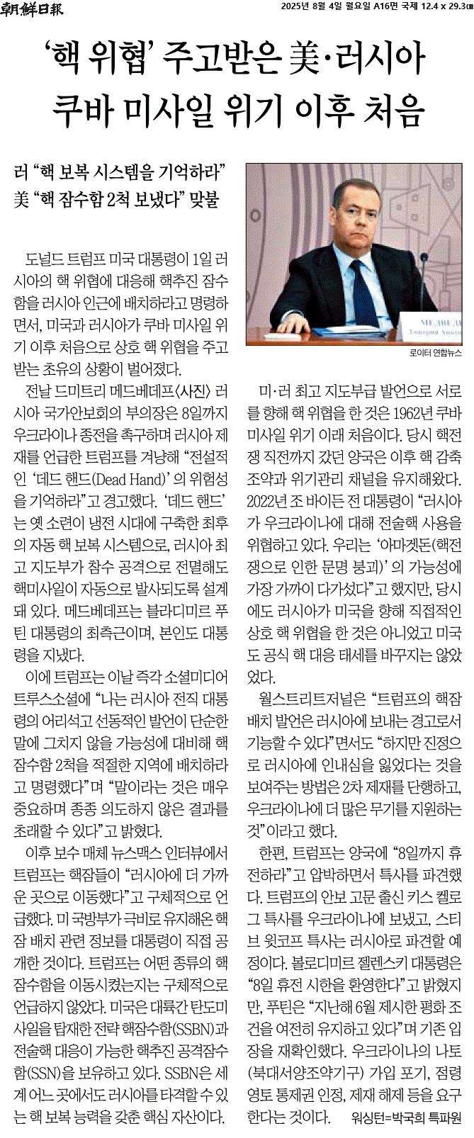 ② 전날 드미트리 메드베데프 러시아 국가안보회의 부의장은 오는 8일까지 우크라이나 종전을 촉구하며 러시아 제재를 언급한 트럼프를 겨냥해 “전설적인 ‘데드 핸드(Dead Hand)’의 위험성을 기억하라”고 경고했다. ‘데드 핸드’는 옛 소련이 냉전 시대에 구축한 최후의 자동 핵보복 시스템으로, 러시아 최고 지도부가 참수 공격으로 전멸해도 핵미사일이 자동으로 발사되도록 설계돼 있다.