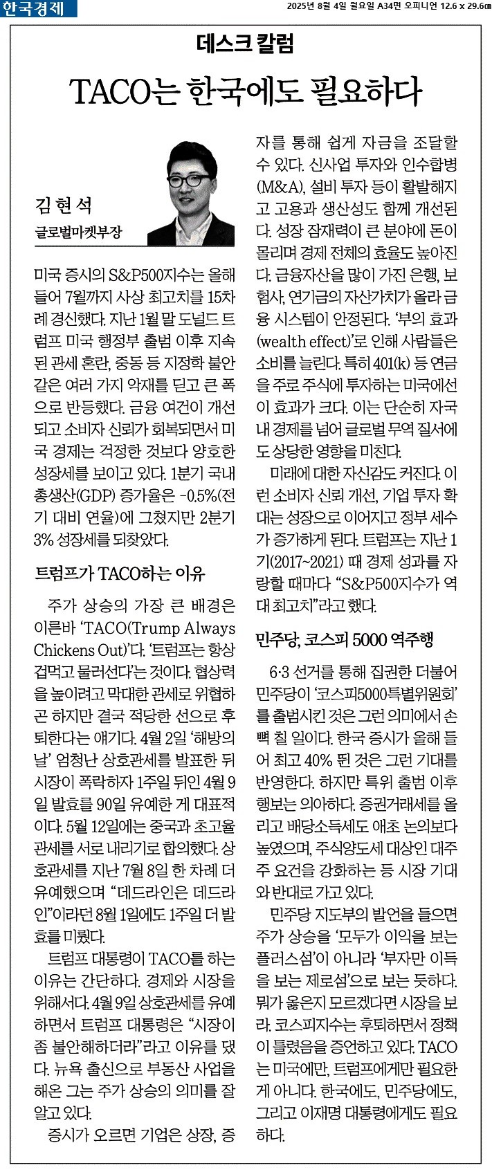 ⑤ 민주당 지도부의 발언을 들으면 주가 상승을 ‘모두가 이익을 보는 플러스섬’이 아니라 ‘부자만 이득을 보는 제로섬’으로 보는 듯하다. 뭐가 옳은지 모르겠다면 시장을 보라. 코스피지수는 후퇴하면서 정책이 틀렸음을 증언하고 있다. TACO는 미국에만, 트럼프에게만 필요한 게 아니다. 한국에도, 민주당에도, 그리고 이재명 대통령에게도 필요하다.