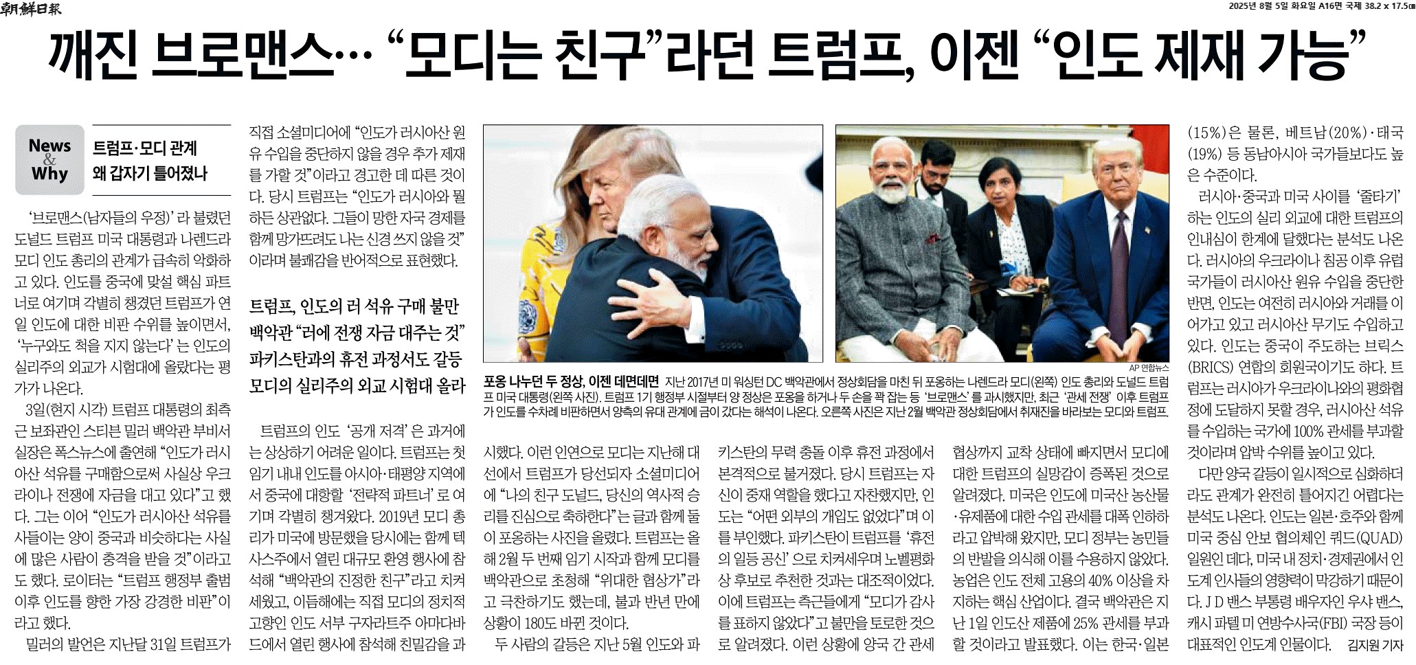 ① ‘브로맨스(남자들의 우정)’라 불렸던 도널드 트럼프 미국 대통령과 나렌드라 모디 인도 총리의 관계가 급속히 악화하고 있다. 인도를 중국에 맞설 핵심 파트너로 여기며 각별히 챙겼던 트럼프가 연일 인도에 대한 비판 수위를 높이면서, ‘누구와도 척을 지지 않는다’는 인도의 실리주의 외교가 시험대에 올랐다는 평가가 나온다.